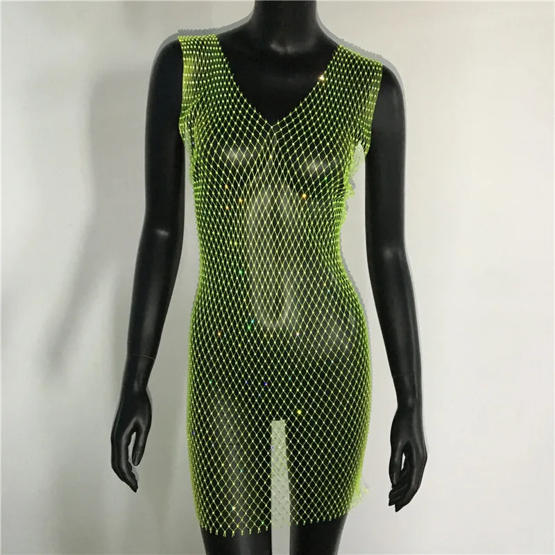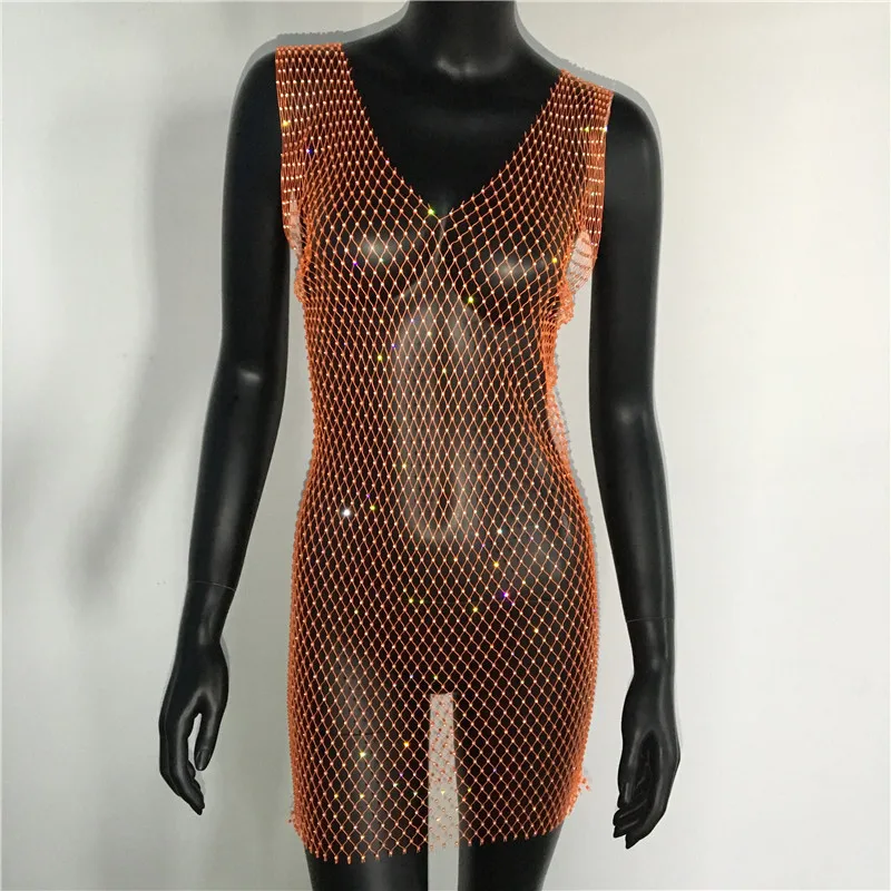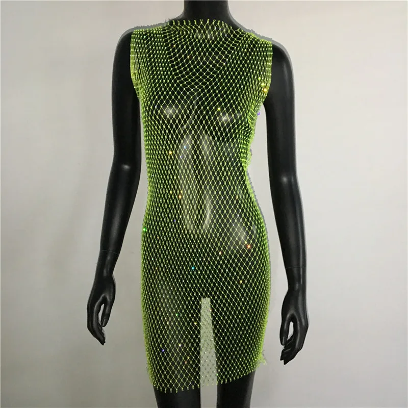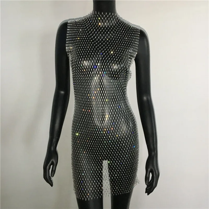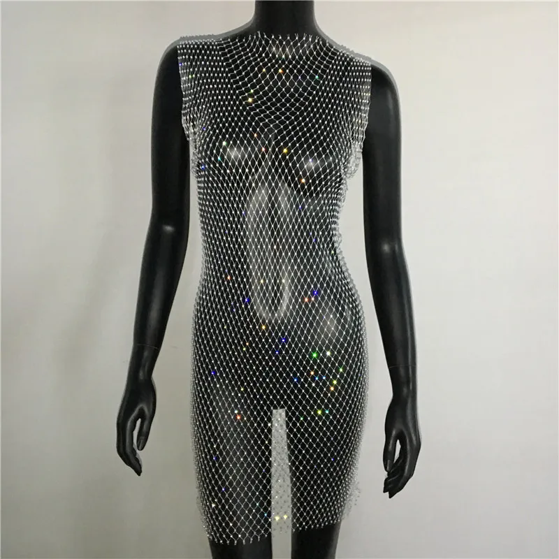 Лидер продаж в сетку с украшениями в виде кристаллов бриллиантов платье в клетку без рукавов с О-образным вырезом, сексуальное прозрачная Для женщин обтягивающие Мини-платья ночные Вечерние