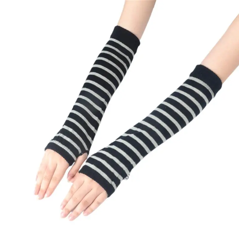 Женские вязаные длинные перчатки без пальцев, зимние эластичные длинные перчатки с принтом в полоску, с вырезом для большого пальца