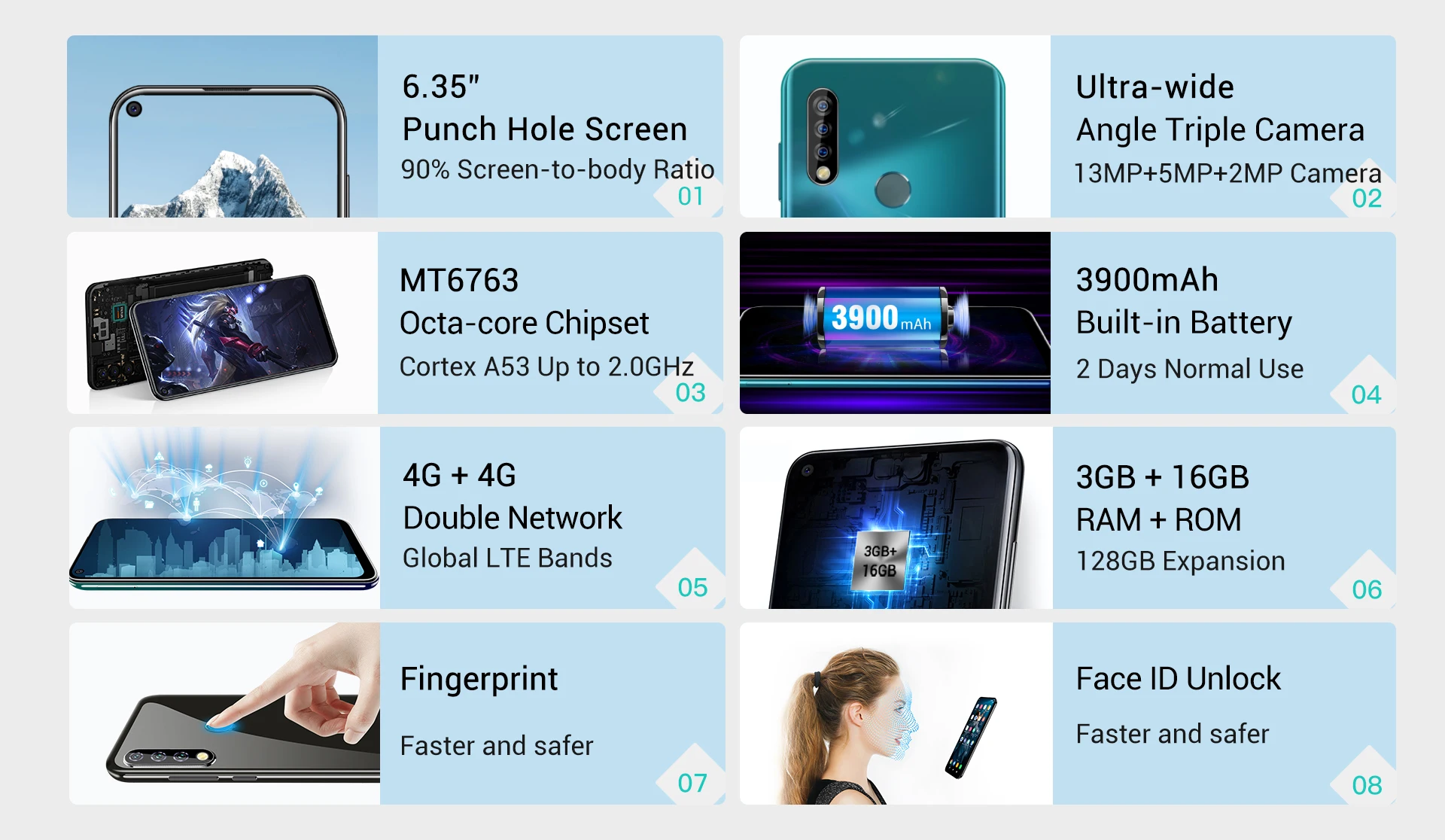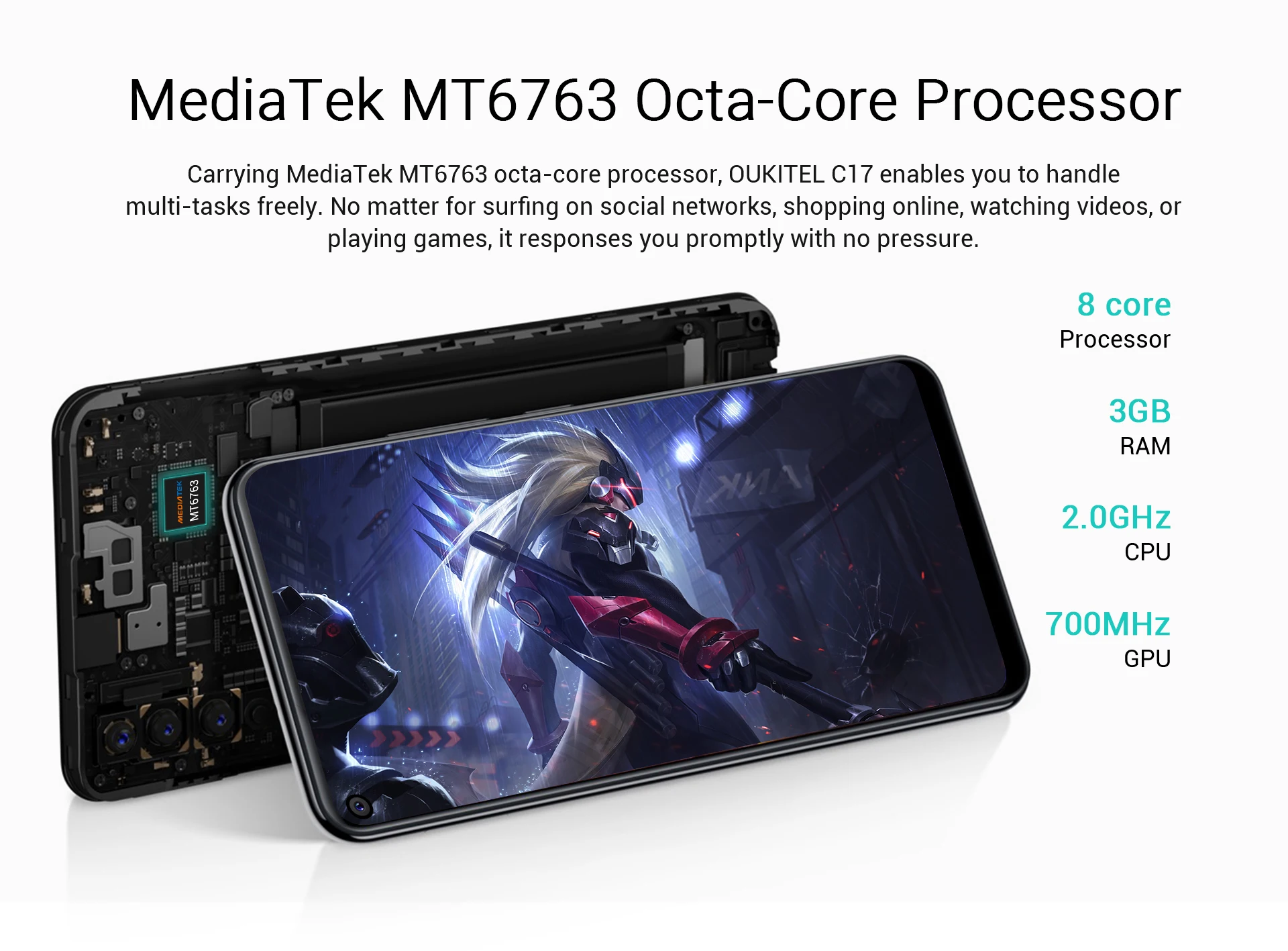ЦП: MT6763 Octa Core Cortex A53, 2,0 ГГц ОС: Android 9,0 Память: 3 ГБ ОЗУ + 16 Гб ПЗУ SIM: две sim-карты двойной режим ожидания Размер экрана: 19,5: 9/6,35 "глухого отверстия Дисплей Разрешение дисплея: 720*1560 ips Задняя камера: 13,0 МП + 5,0 Мп + 2 МП Фронтальная Камера: 5.0MP Батарея: 3900 мА-ч