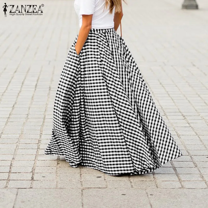 Осень 2021, длинная юбка ZANZEA, женские плиссированные юбки на молнии, женские длинные клетчатые юбки макси в клетку с карманами, женские богемные юбки