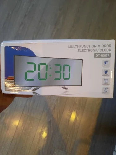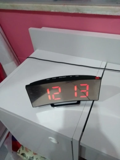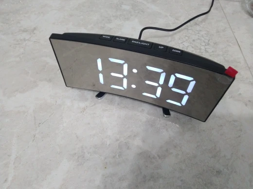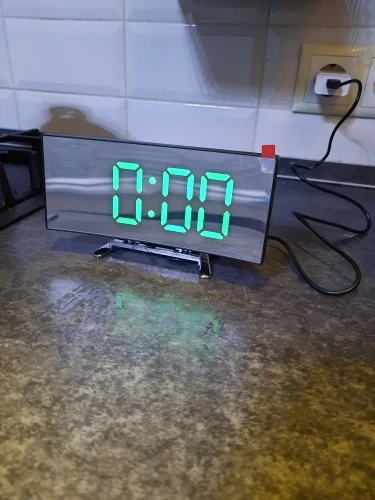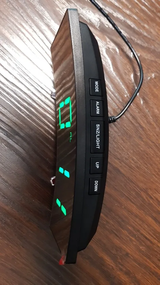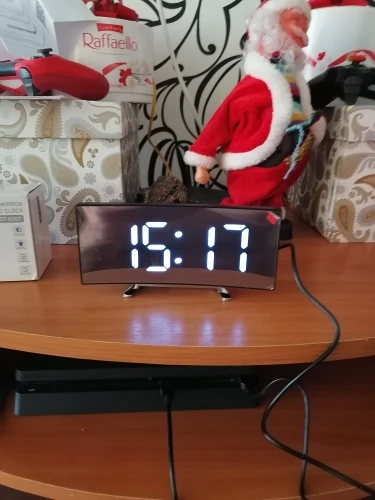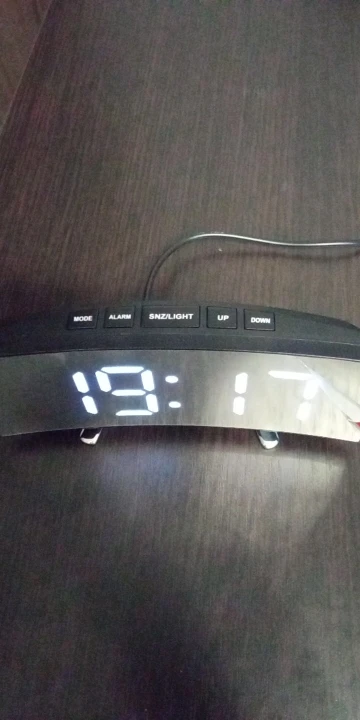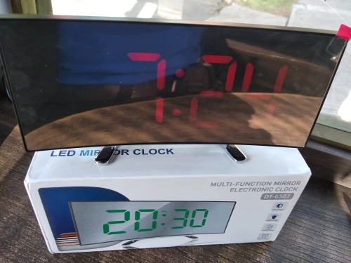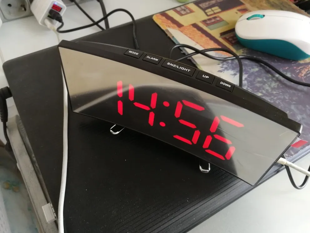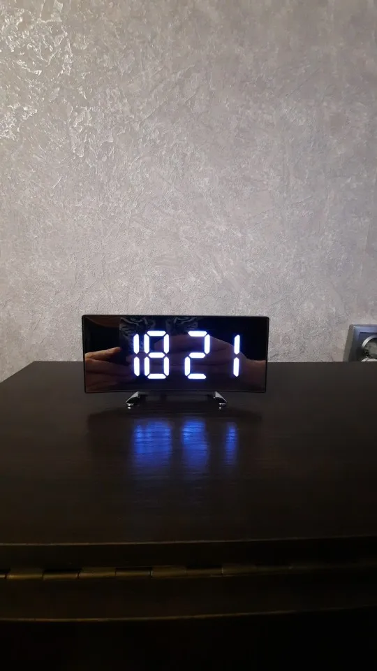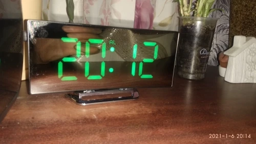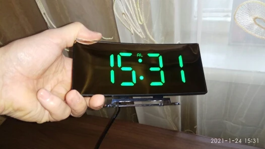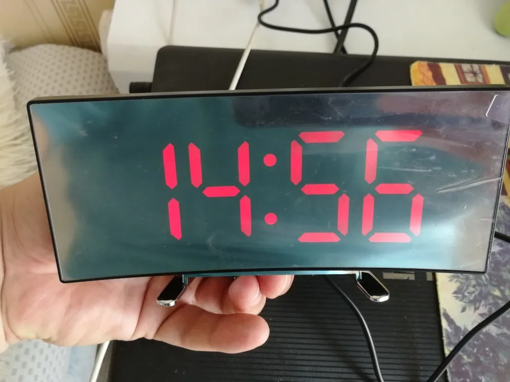 В принципе неплохой товар. Коробка была слегка помята, но сами часы внутри без повреждений. Достаточно крупные, как раз то, что мне надо. На фотографии видно - какой размер относительно мужской ладони. Единственное, что мне не понравилось - штекер питания перпендикулярно корпусу, выпирает. И на фотографиях продавца этого не видно. Смысл зеркальной поверхности часов я не понял.