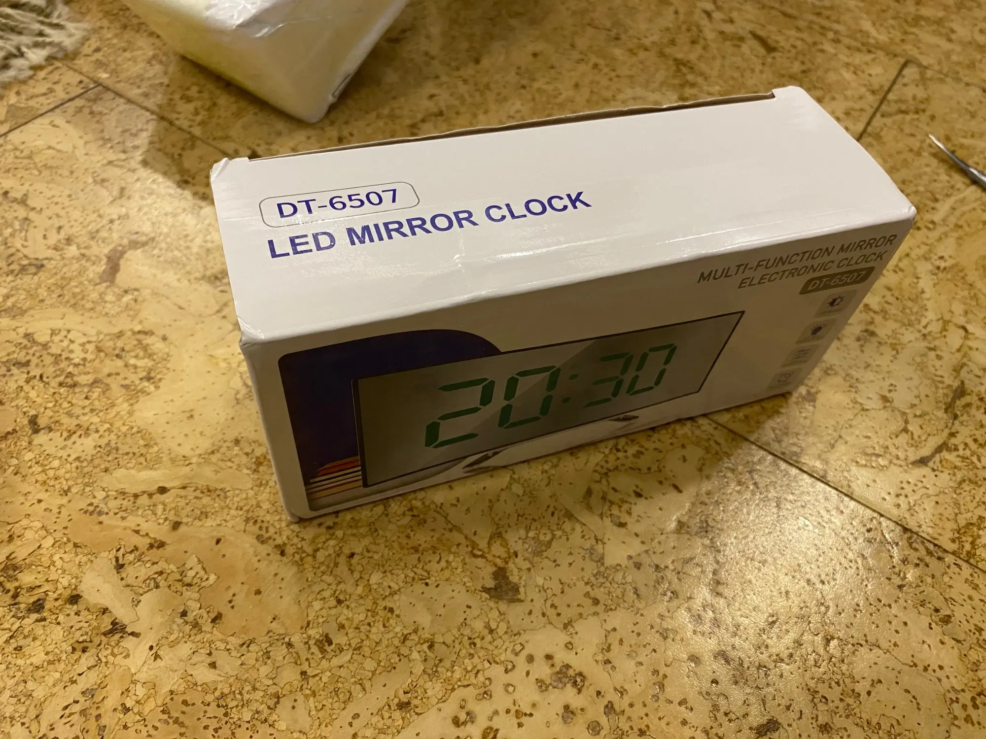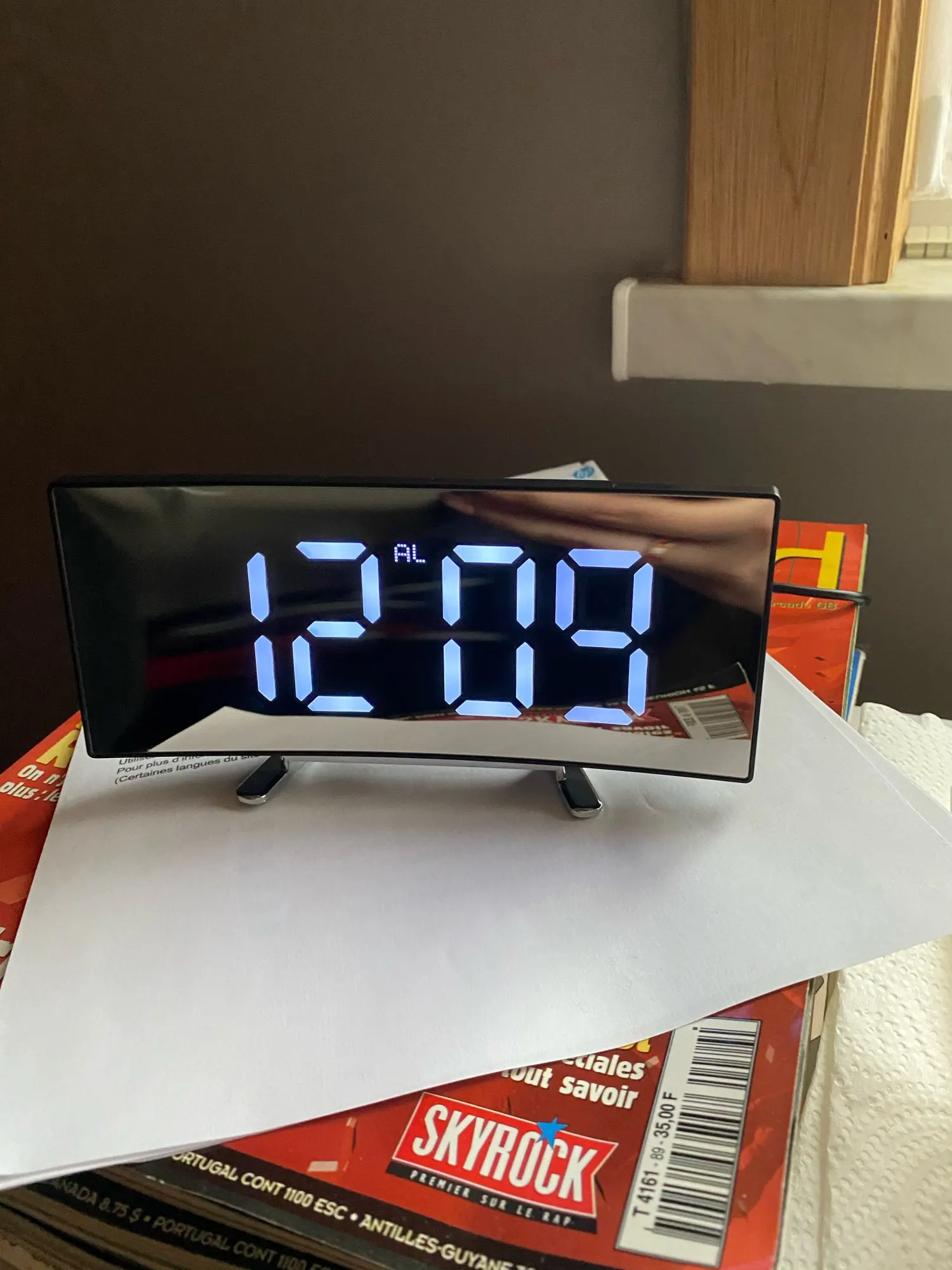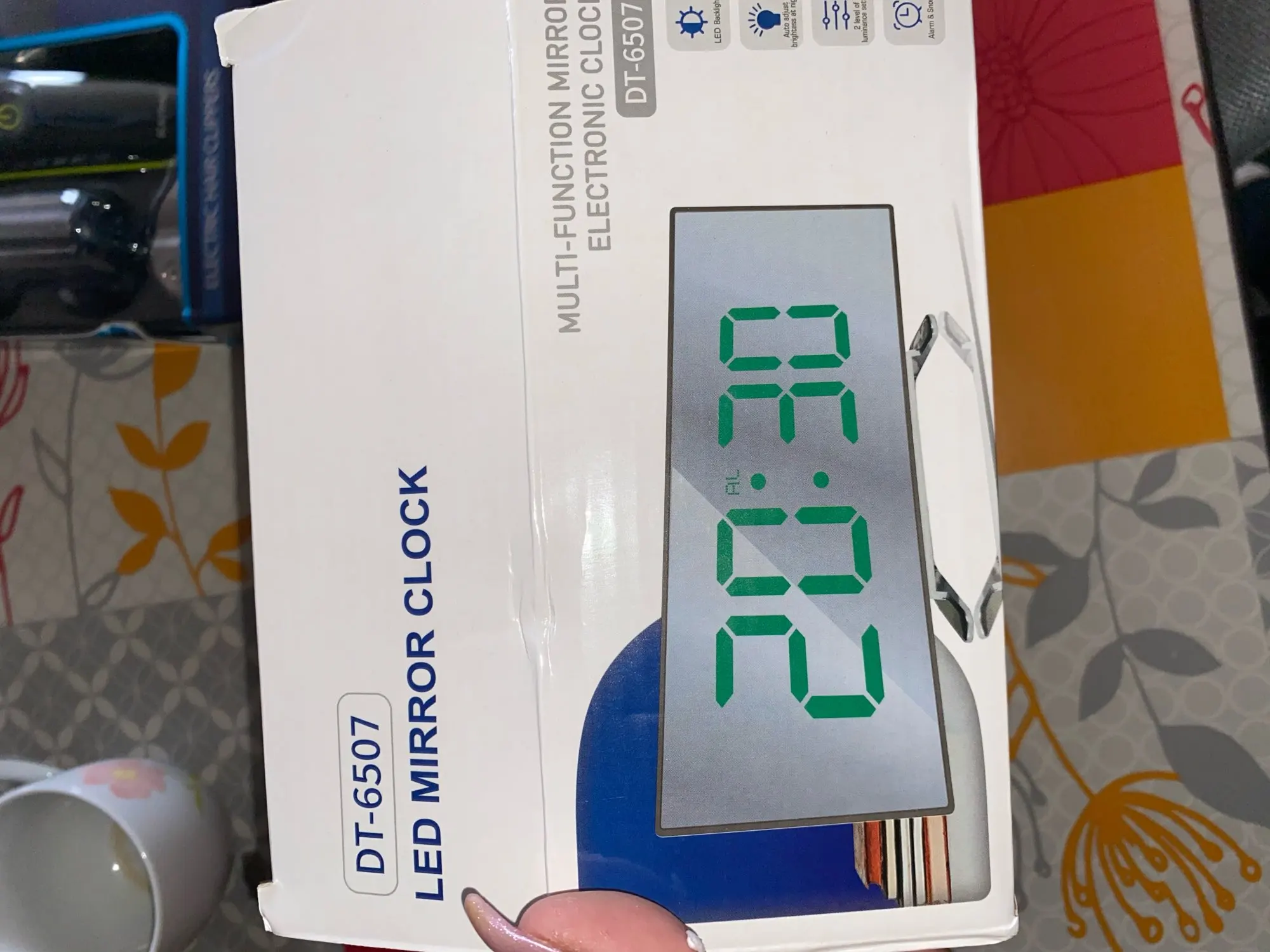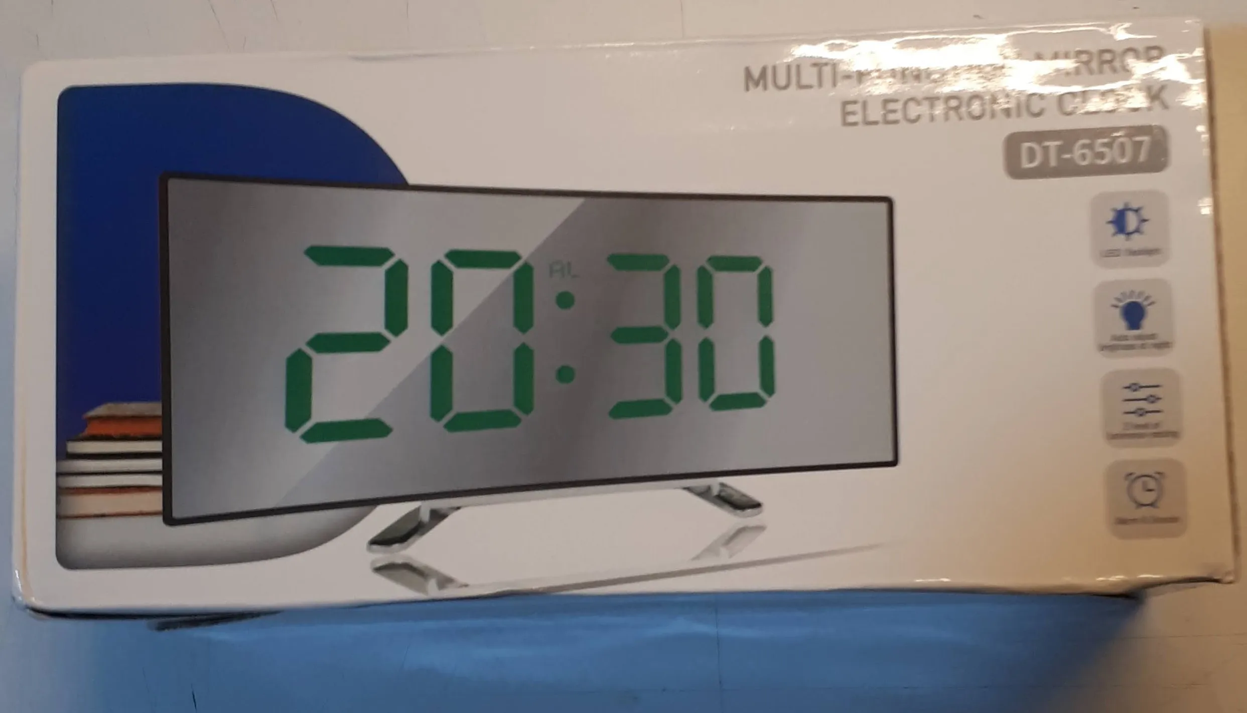 В принципе неплохой товар. Коробка была слегка помята, но сами часы внутри без повреждений. Достаточно крупные, как раз то, что мне надо. На фотографии видно - какой размер относительно мужской ладони. Единственное, что мне не понравилось - штекер питания перпендикулярно корпусу, выпирает. И на фотографиях продавца этого не видно. Смысл зеркальной поверхности часов я не понял.