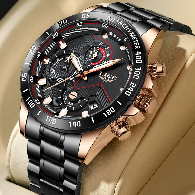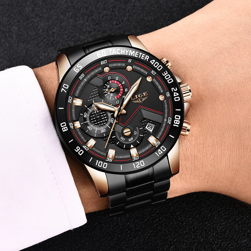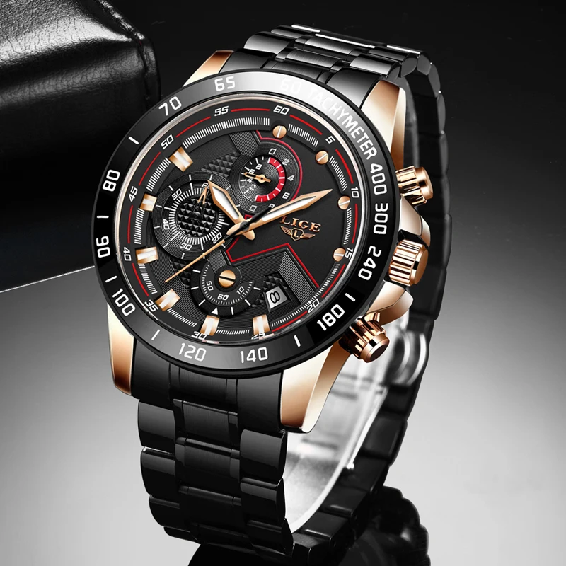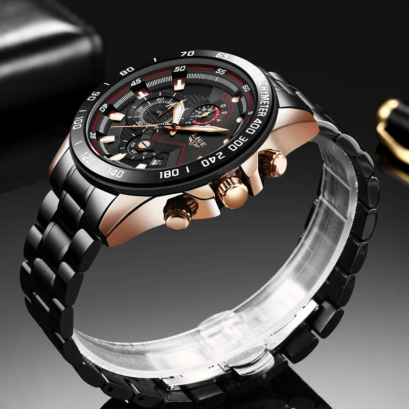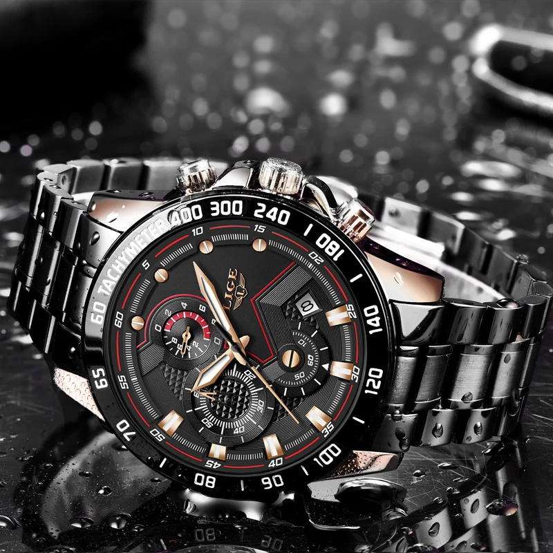 Часы наручные LIGE Мужские кварцевые, брендовые Роскошные полностью стальные водонепроницаемые с хронографом