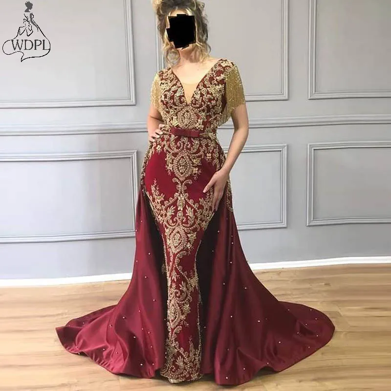 Женское вечернее платье-русалка, элегантное платье с золотистой кружевной аппликацией и кисточками, платье для выпускного вечера со съемным шлейфом, Дубай, арабский, бордовый цвет