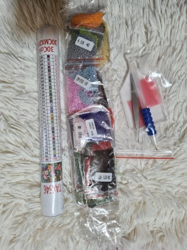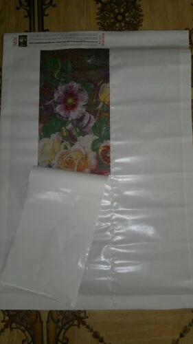 Я довольна работой продавца. Заказ пришёл даже раньше указанного срока. Все соответствует описанию. Сама картина намотана рулончиком на поролоновую палочку, поэтому ровненькая, не помятая. Всё упаковано в пупырчатую плёнку. Стразы упакованы в подписанные мешочки. Только начала работу, но мне кажется, что страз положено достаточное количество.