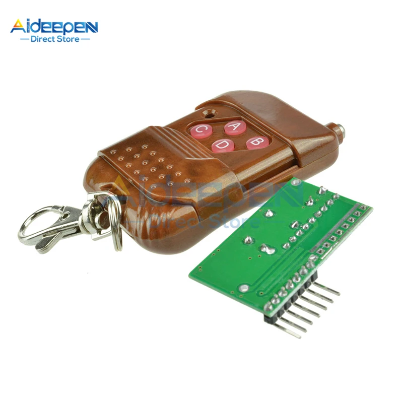 На пульте дистанционного управления расположены четыре кнопки и соответствуют четырем битам данных выходным контактам приемной платы D0, D1, D2 и D3. Нажмите кнопки передают сигналы, соответствующий бит данных выводится высоко.