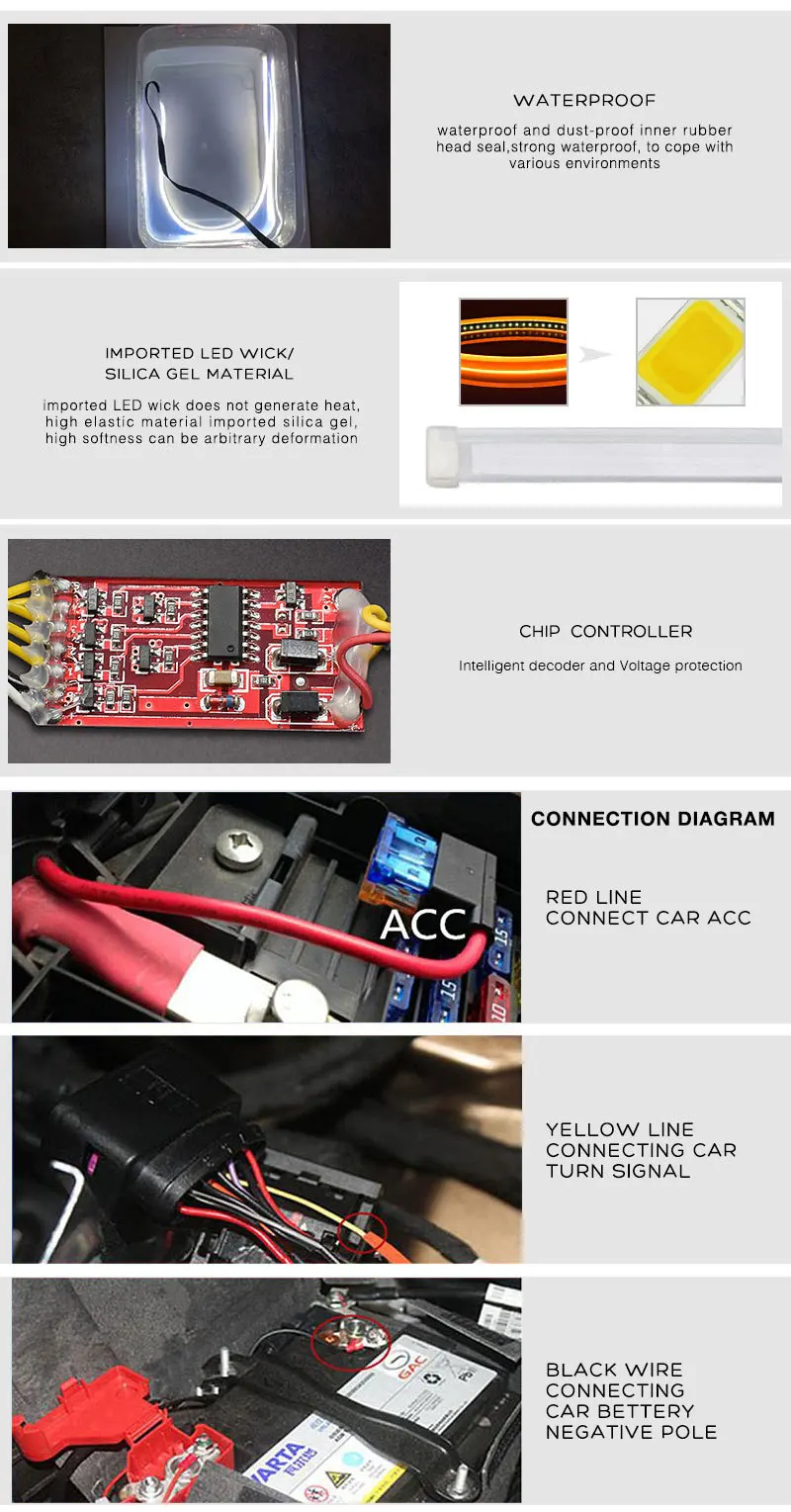 Красный провод, пожалуйста, подключен к автомобильному питанию ACC +, черный провод, пожалуйста, Подключите автомобильное питание ACC-, желтый провод, Пожалуйста, подключите автомобильный сигнальный светильник при включении питания, цвет одного цвета постоянно при вождении, лампа будет показывать завершенный эффект при повороте, например, ссылка на видео