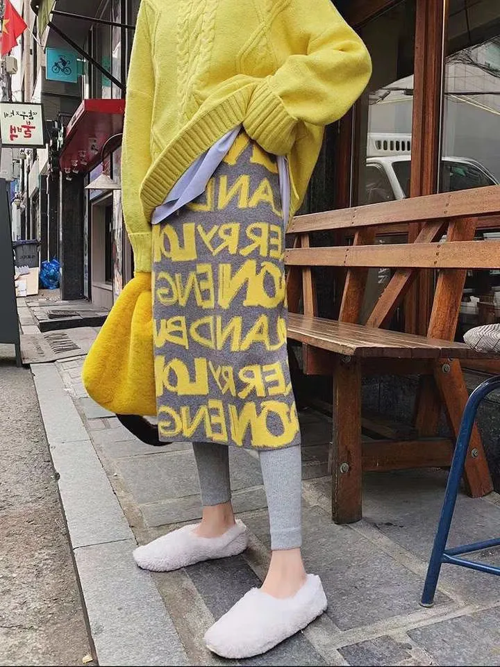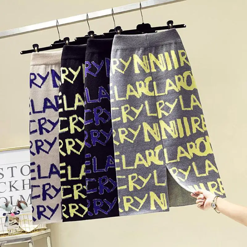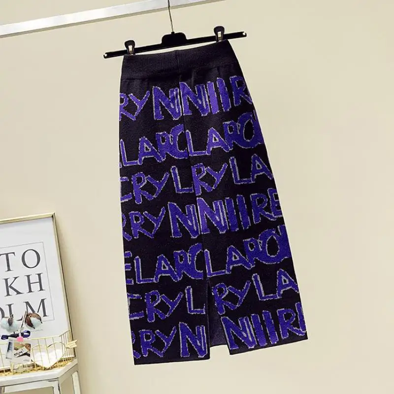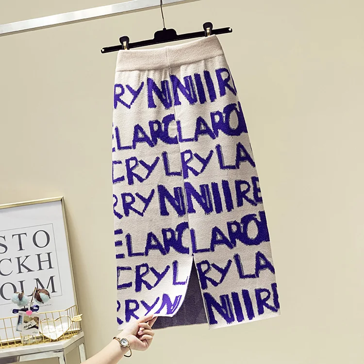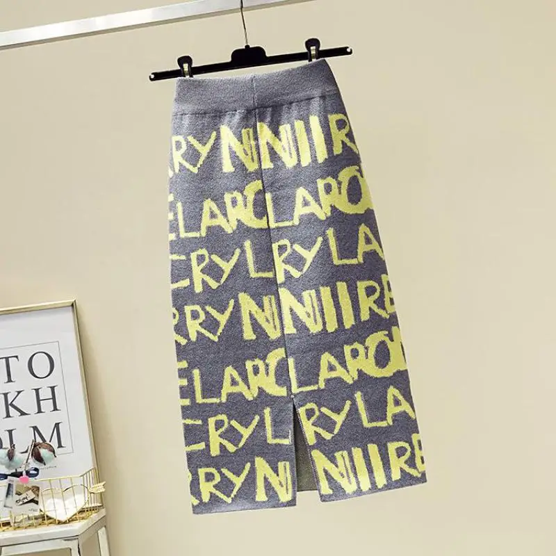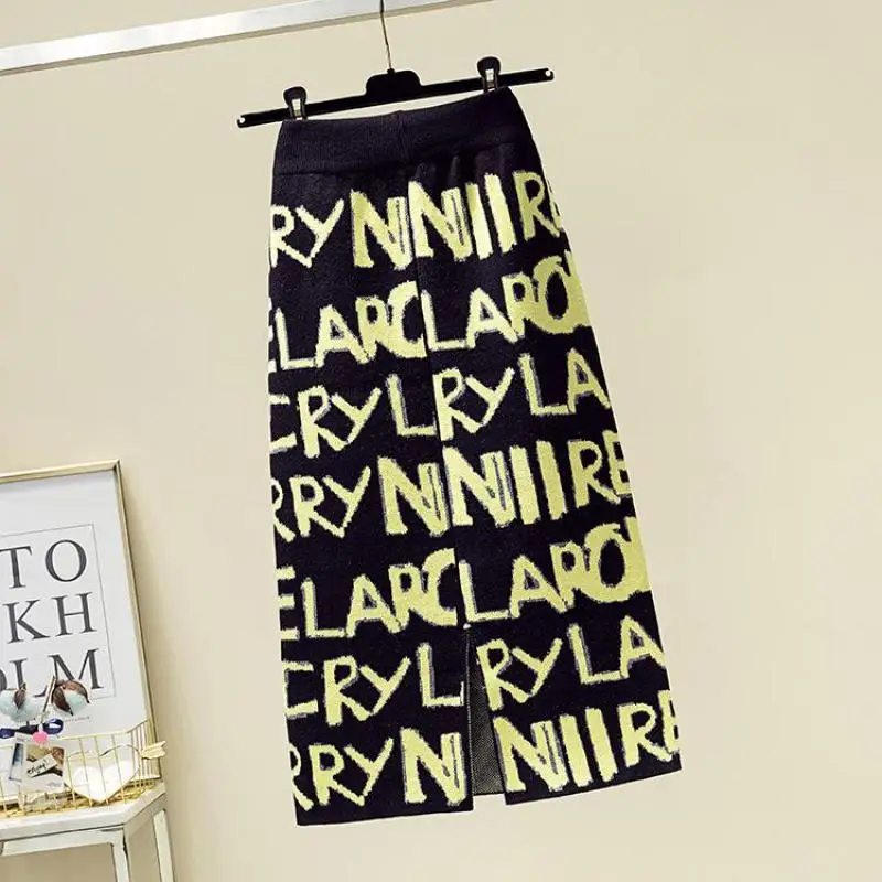 Осень-зима 2022, Новое поступление, вязаная юбка с буквенным принтом, облегающая юбка средней длины, эластичная юбка с высокой талией, бесплатная доставка