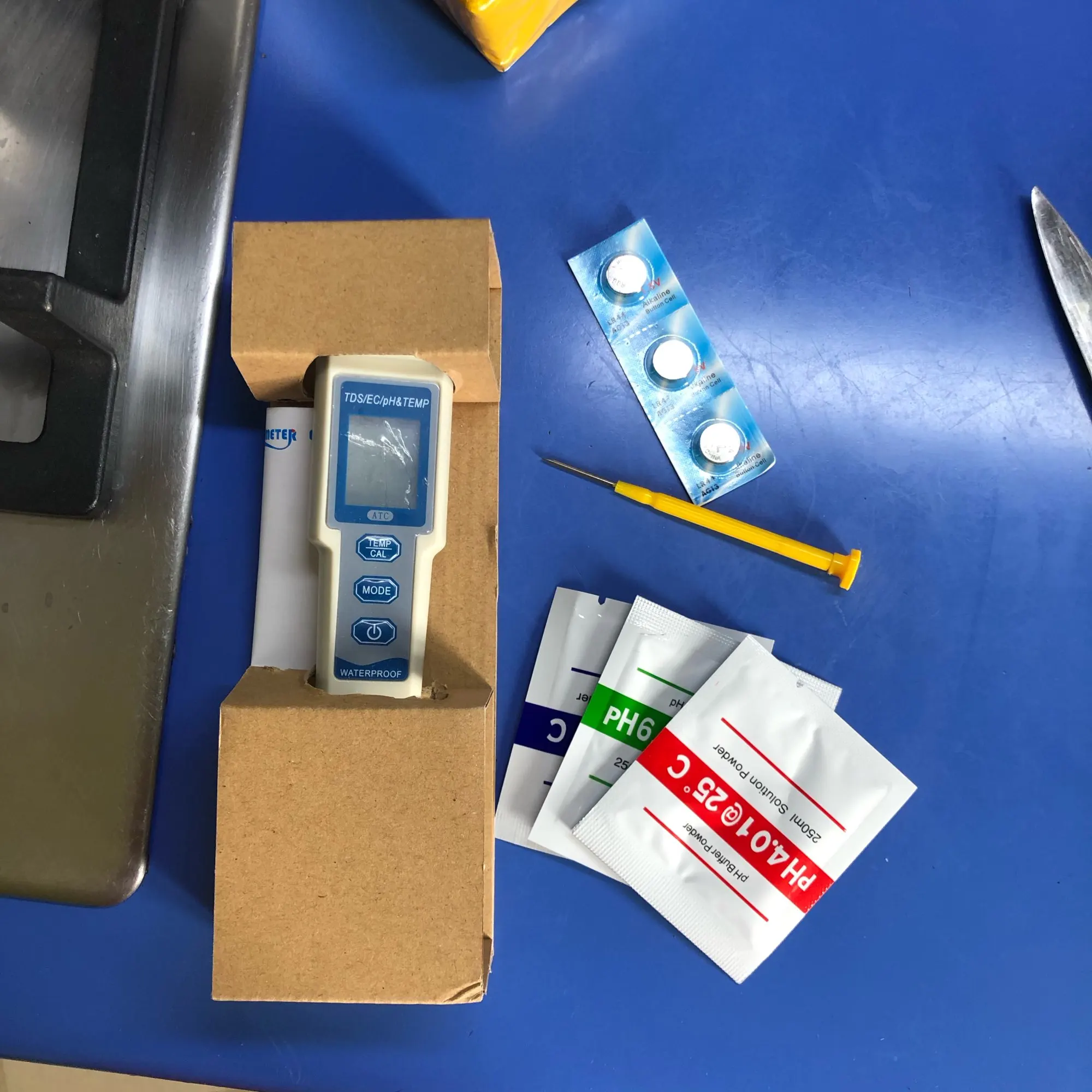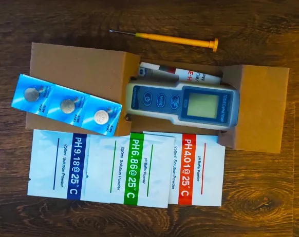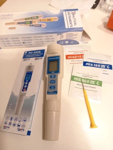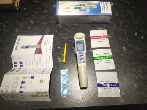 Качественный товар. В комплекте: 3 пакета порошка для калибровки pH (4.01; 6.86 и 9.18), набор бумажных полосок для индикации pH, часовая отвёрка для калибровки и красочная иллюстрированная инструкция ( на английском). Несколько разочаровала индикация: один слабенький светодиод снизу дисплея плохо освещает верхнюю часть - практически не видны символы единиц измерения. А их видеть надо, поскольку на более чувствительных пределах почему-то нет индикации типа измерения. Быстрая доставка в Питер. Продавцу - спасибо.