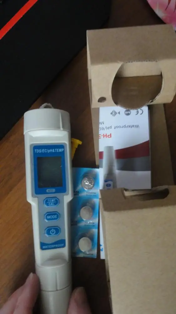Доставка быстрая, заказывал из РФ. Может быть поэтому в комплете не было батареек и калибровочного порошка Ph. Особенно разочаровало отсутствие порошка. Инструкция на английском. В ней указано, что прибор обладает температурной компенсацией. Попробовал измерить параметры одной и той же воды при 20° и 40°. И если показания Ph изменились незначительно, с 5.35 до 5.55, то показания ppm улетели в полтора раза, с 20 до 35. Здесь можно сделать вывод, что прибор обладает сомнительной термокомпенсацией. Какова эталонная температура измерения, и где взять поправочные таблицы - пока не понятно, надеялся, что прибор это будет делать сам. Думаю, для бытовых нужд всё же сойдёт.