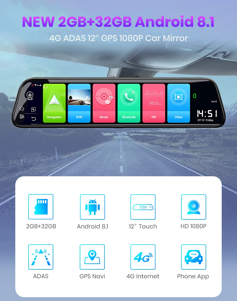 Видеорегистратор-зеркало заднего вида, 2 камеры 1080P, 4G, 12 дюймов, ADAS