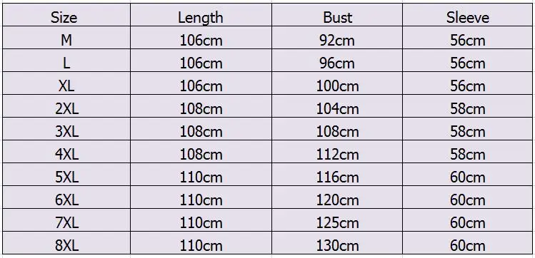 M: Длина: 106 см бюст: 92 см рукав: 56 см L: Длина: 106 см бюст: 96 см рукав: 56 см XL: Длина: 106 см бюст: 100 см рукав: 56 см XXL: длина: 108 см бюст: 104 см рукав: 58 см 3XL: длина: 108 см бюст: 108 см рукав: 58 см 4XL: длина: 108 см бюст: 112 см рукав: 58 см 5XL: длина: 110 см бюст: 116 см рукав: 60 см 6XL: длина: 110 см Бюст: 120 см рукав: 60 см 7XL: длина: 110 см бюст: 125 см рукав: 60 см 8XL: длина: 110 см бюст: 130 см рукав: 60 см