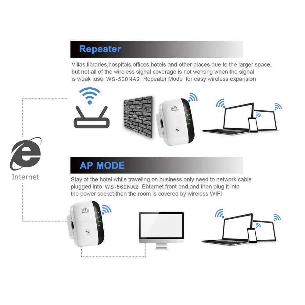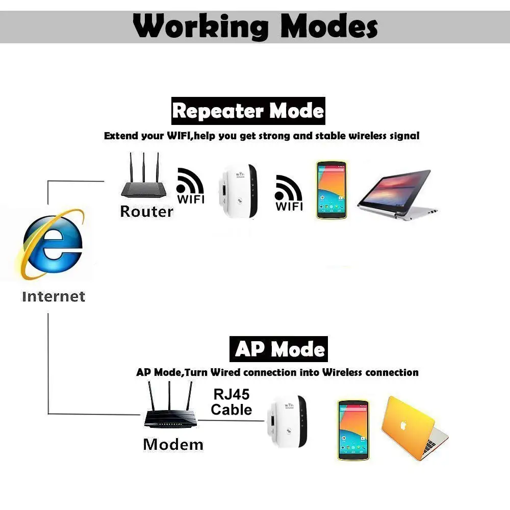 Режим реле: от беспроводной к беспроводной: После получения беспроводного сигнала от оригинального беспроводного маршрутизатора ретранслятор повторно передает новый беспроводной сигнал для достижения эффекта расширения и расширения покрытия. Совместим со всеми беспроводными роутерами (необходимо знать имя пользователя и пароль беспроводного сигнала), Настройка очень проста. Товар поставляется с инструкцией. Можно установить мобильные телефоны, компьютеры и планшеты, установить нужно только один раз, можно использовать все беспроводные устройства.