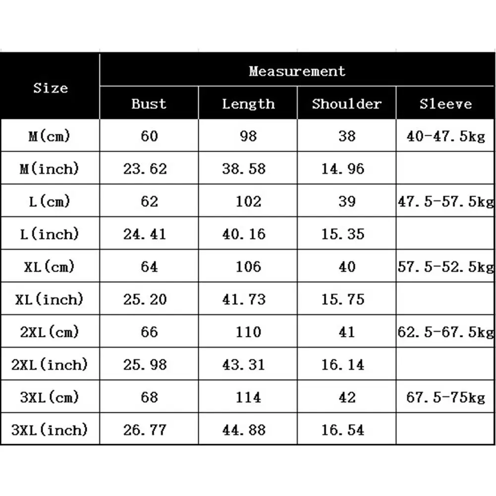 Размер: длина, бюст, плечо, вес; M:60 см, 98 см, 38 см, 40-47,5 кг; L:62 см, 102 см, 39 см, 47,5-57,5 кг; XL:64 см, 106 см, 40 см, 57,5-52,5 кг; 2XL:66 см, 110 см, 41 см, 62,5-67,5 кг; 3XL:68 см, 114 см, 42 см, 67,5-75 кг;