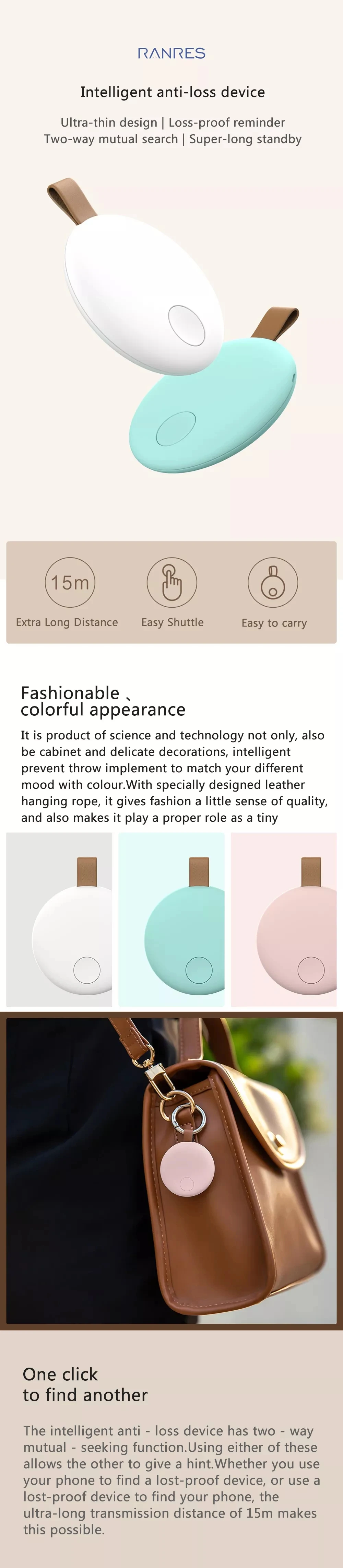 Изящный дизайн, напоминание о потере Двусторонний взаимный поиск Очень долгий режим ожидания Спецификация: Название продукта: умное устройство защиты от потери Ranres Модель продукта: RW01MN Материал продукта: белый, розовый, синий Размер продукта: 42x42x8 мм Вес изделия: 10 г