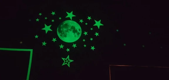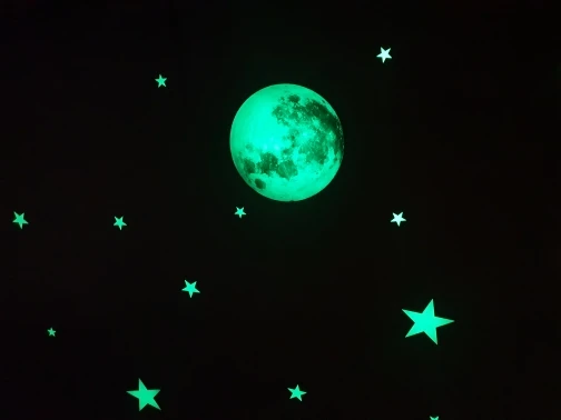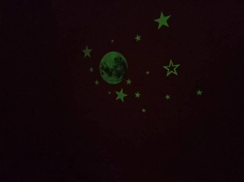 Очень красивая луна, большая хорошо светится. днём тоже выглядит красиво. пришла быстро, запакована в трубочку, но ничего не повредилось, на Укрпочту. Маленькие звёздочки смотрятся красивее крупных. Брала отдельно набор маленьких, они из другого материала, выпуклые, очень ярко светят, хоть и лепить долго.