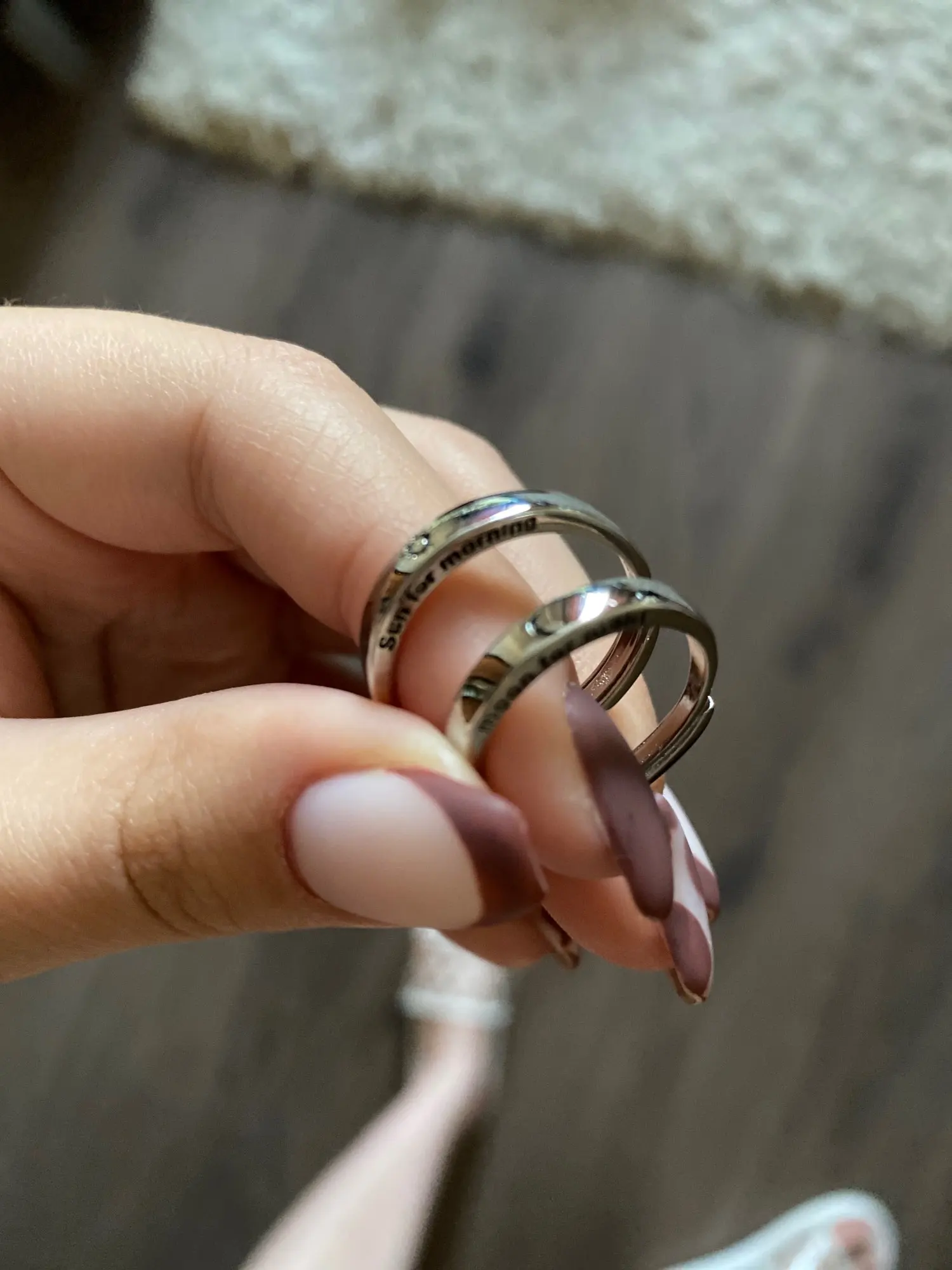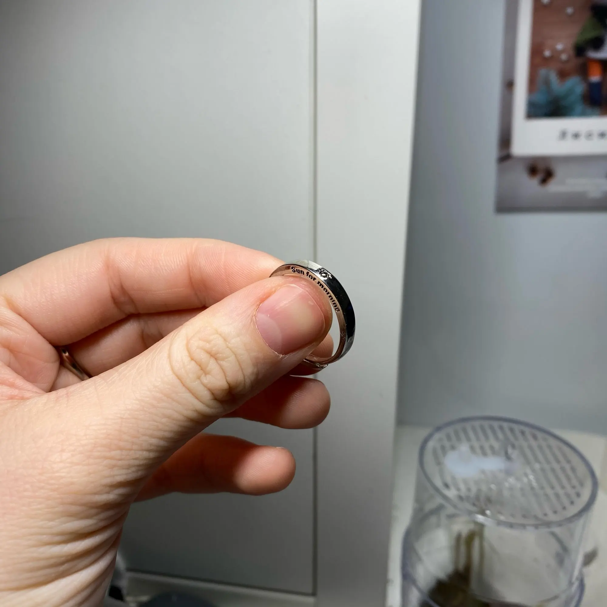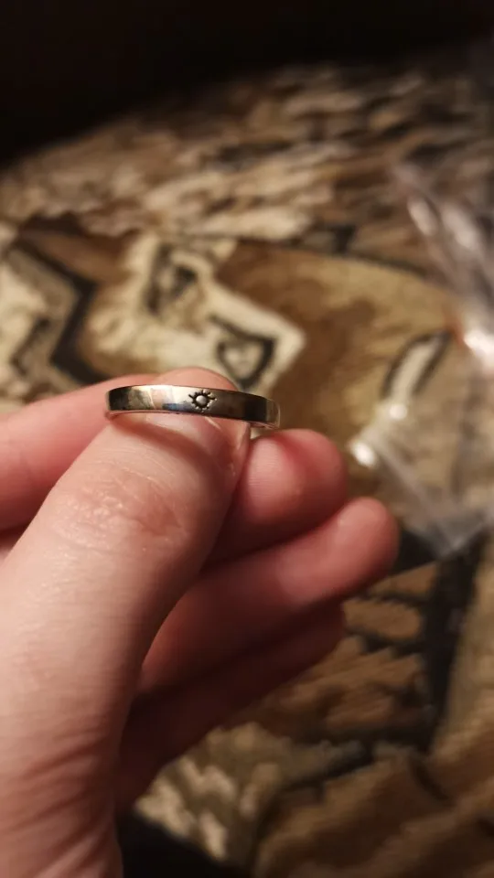 довольно качественно сделанные колечки то что с солнышком все же побольше будет, но не критично регулируется размер, миленькие надписи, правда буквально через 2 дня активного ношения немного стёрлась краска по бокам, что довольно обидно