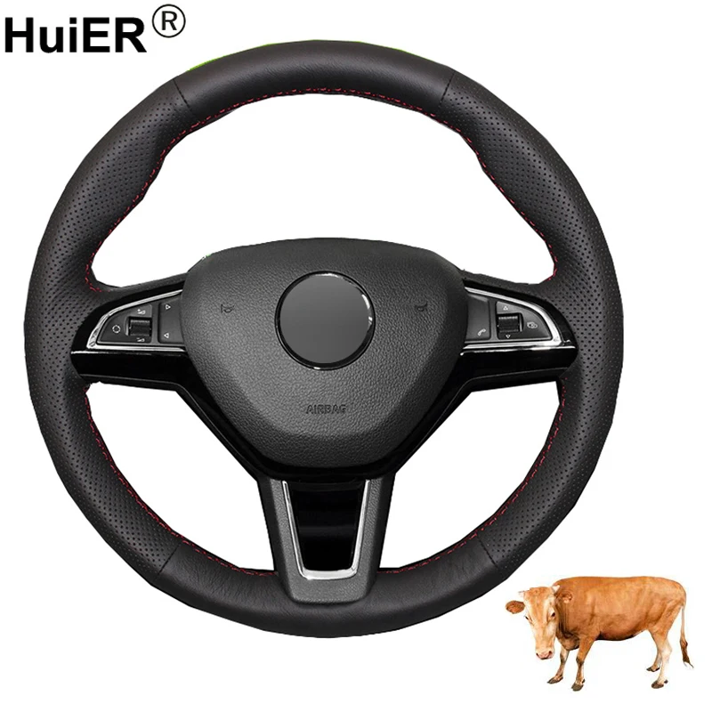 Верхний слой из коровьей кожи чехол на руль для Skoda Citigo 2013-2019 / Fabia 2013-2019 / Karoq 2017-2019 / Roomster 2013-2016 / Rapid 2012-2019 / Octavia 2013-2019 / Superb 2013-2019 / Yeti 2014-2019 / Kodiaq 2016-2019 / Scala 2019.