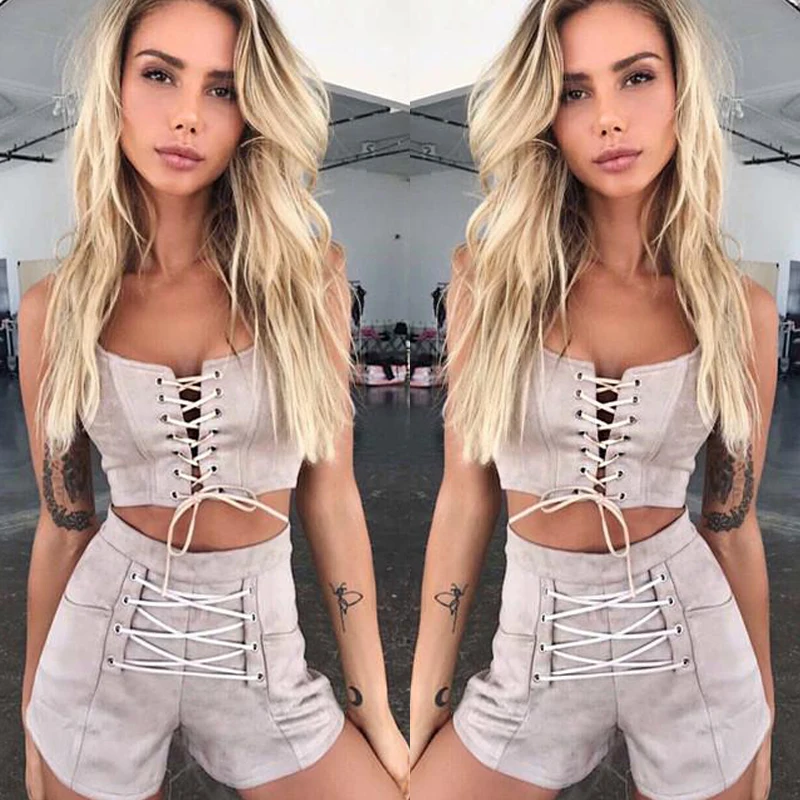 Женский комплект из 2 предметов, облегающий бандо без рукавов, короткий топ со шнуровкой и шорты, спортивный костюм для вечерние ринки, клубный комбинезон