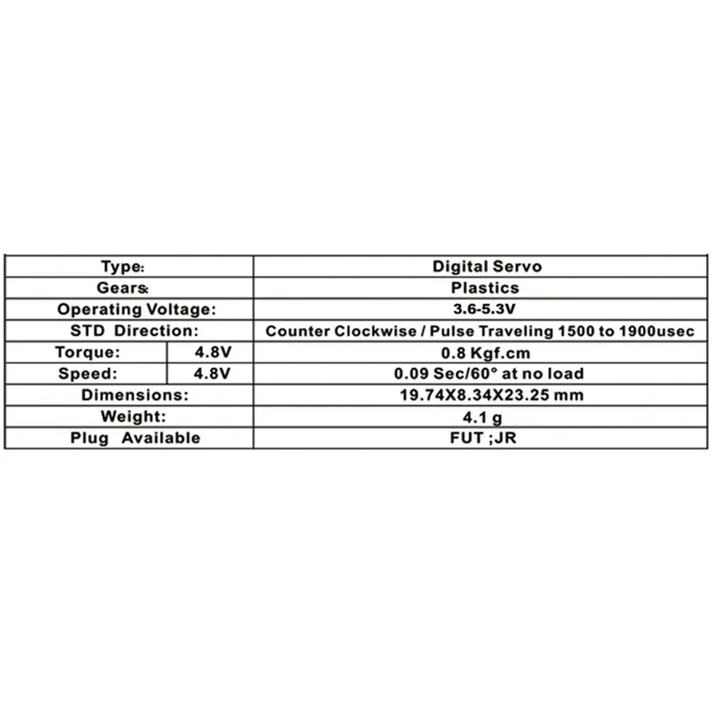 Особенности:1. Высокая производительность мини-размер пластиковые шестерни цифровой сервопривод.2. Высокоточная передача.3. Алюминиевый внутренний корпус с ЧПУ.4. Подходит для RC Самолет с неподвижным крылом вертолета.5. 4,8 V высокой Напряжение.