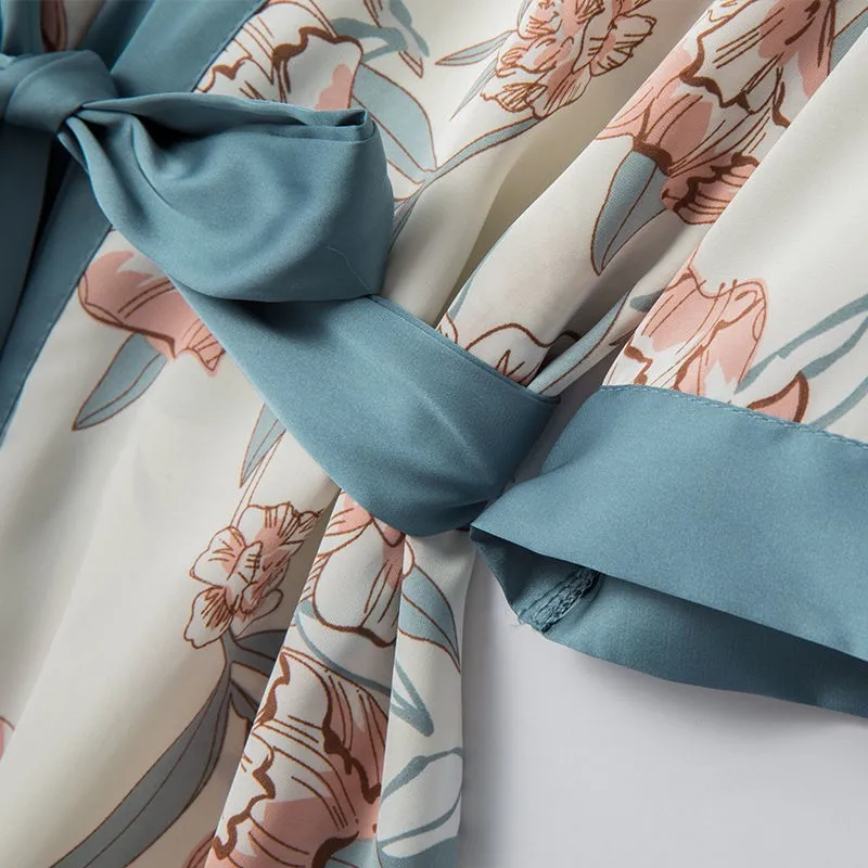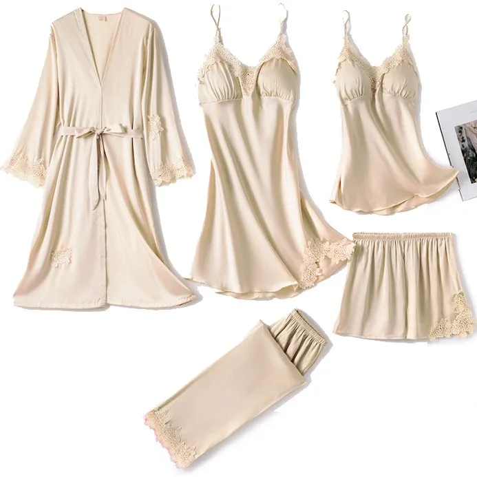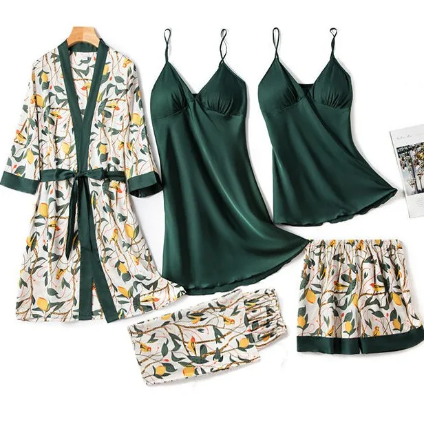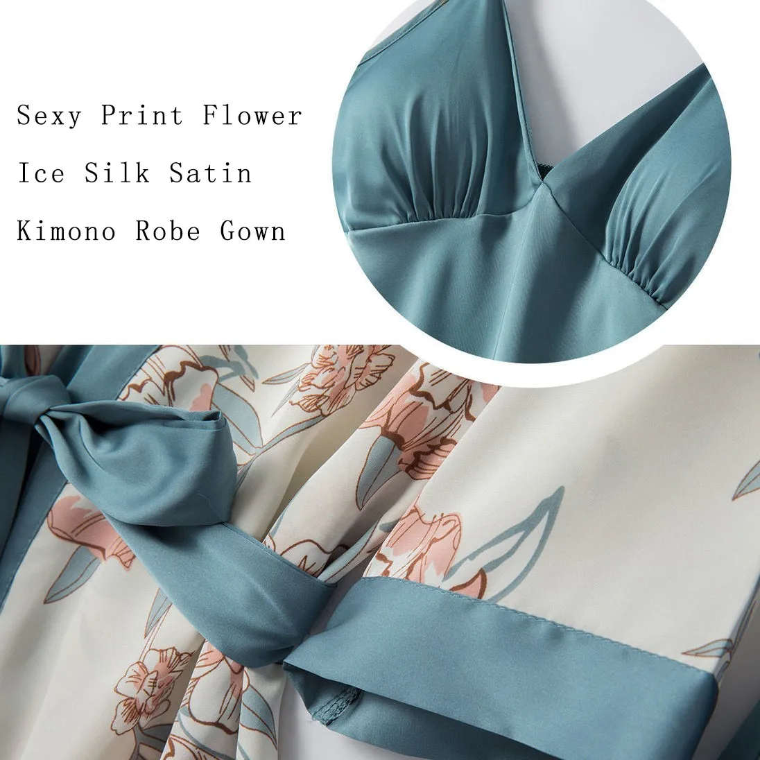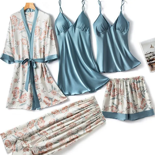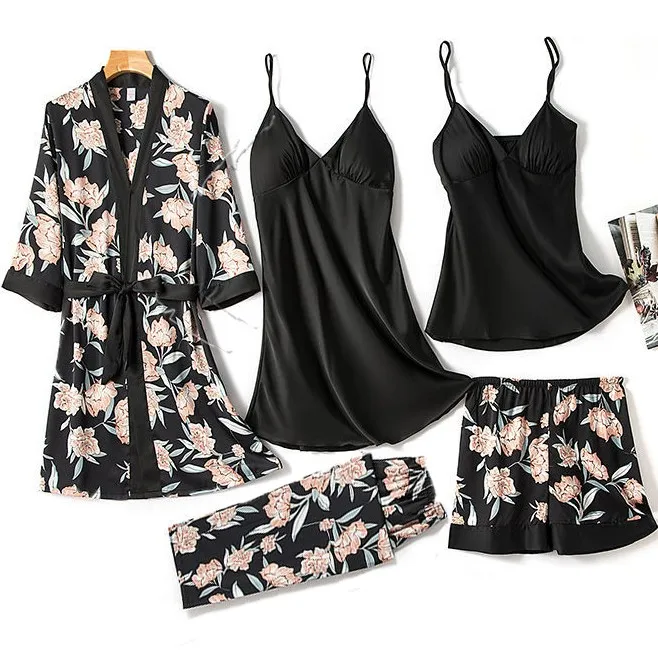 Атласные женские пижамы, 5 шт., халат-кимоно комплектов, с цветочным принтом, летнее тонкое нижнее белье, купальный халат с v-образным вырезом, удобные пижамы