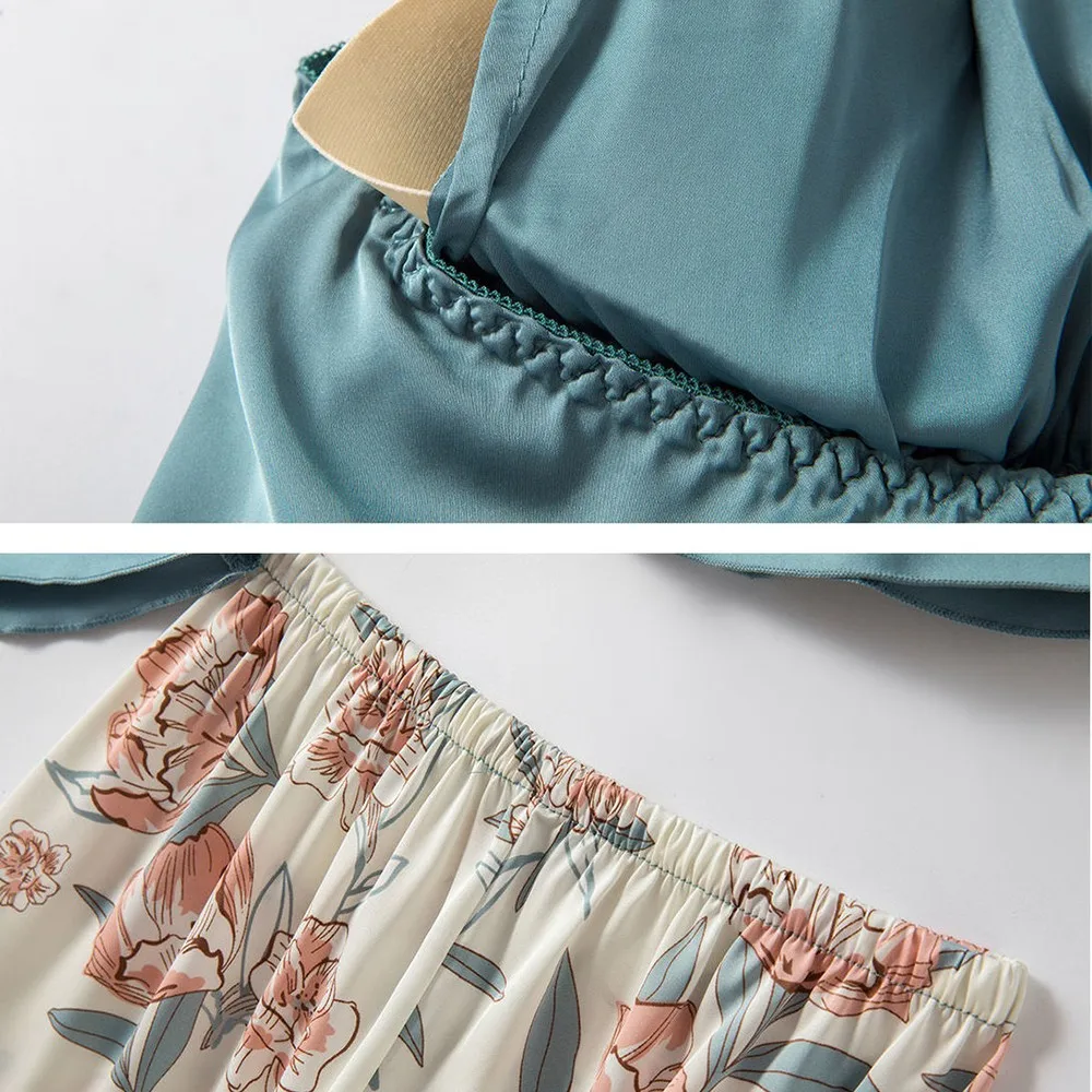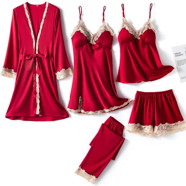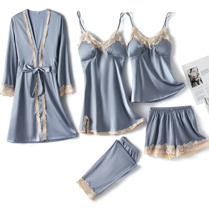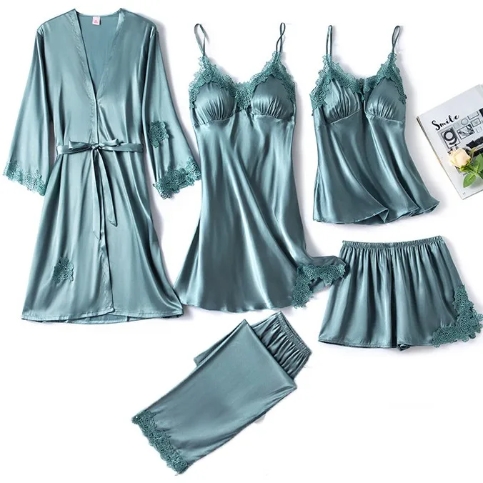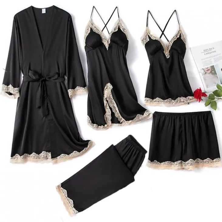 Атласные женские пижамы, 5 шт., халат-кимоно комплектов, с цветочным принтом, летнее тонкое нижнее белье, купальный халат с v-образным вырезом, удобные пижамы