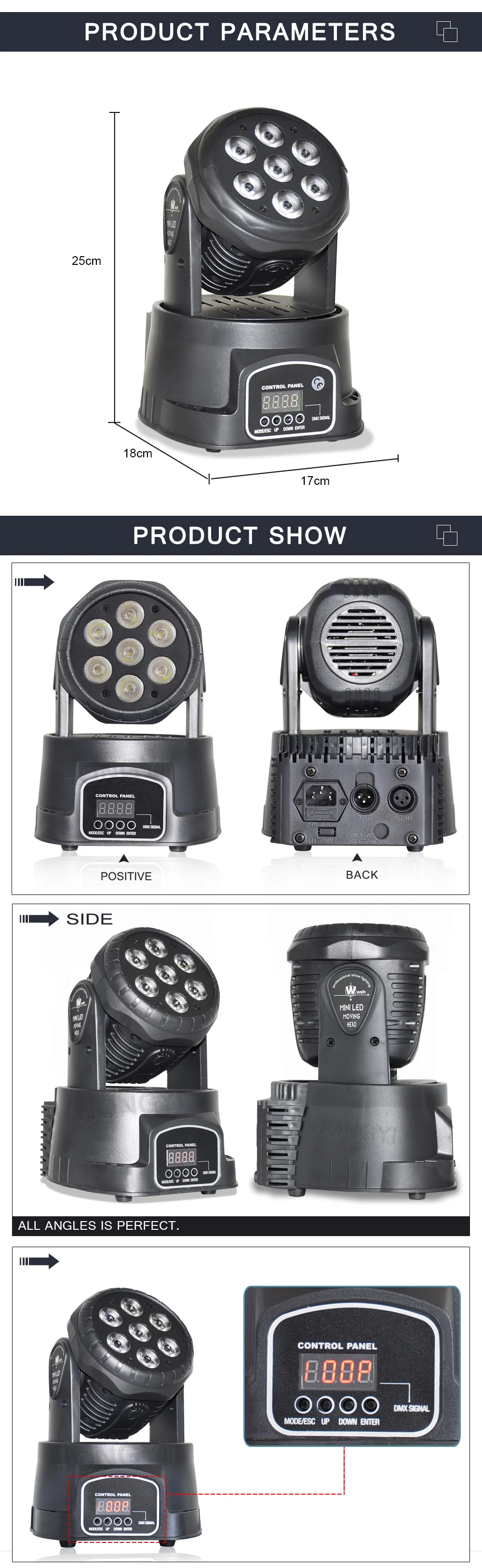 Напряжение: AC90-240V В переменного тока, 50/60 ГцМощность: 100 ВтСветильник источник: 12w4 интегрированные RGBW светодиодныйСрок службы: 5000-10000чУгол луча: 25 градусов.Затемнение: 0-100% линейное затемнениеСтробоскоп: 0-20 раз/сек.Канал: канал 14Горизонтальная/вертикальная: 540 градусов (ось X), 180 (ось Y).Смешанный цвет: RGBW смешанный цветРежим работы: DMX512, master-slave control, automatic, voice control.Охлаждение: вентилятор с низким уровнем шумаДисплей: 4 цифры светодиодный Дисплей экранВес продукта: 3,5 кгПосылка: 27 см * 22 см * 25 см