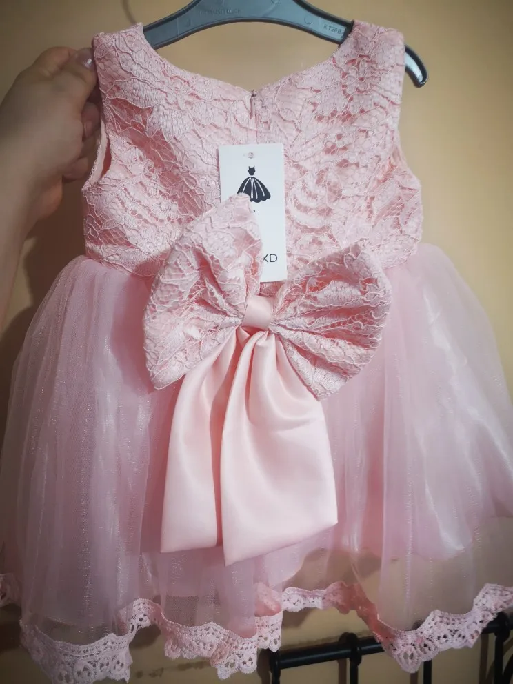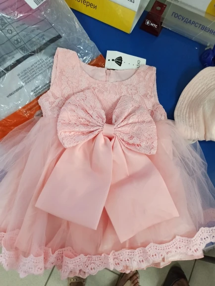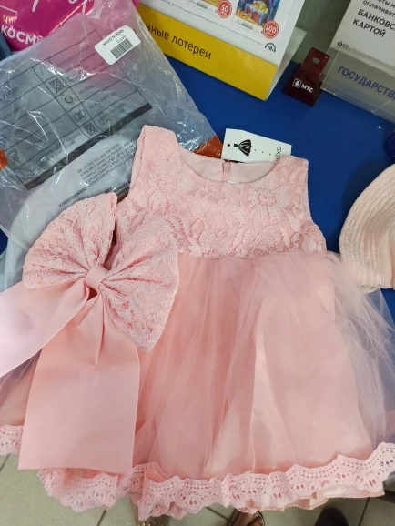 На рост 73 см заказали 9м. Пришло платье с этикеткой 12. Померили оно большое. Написали продавцу, тот ответил что 9м и 12 м это один размер. За что в споре вернул 150 р. Кружева пришиты отвратительно. Кривой стык прямо спереди. Внутри все швы не оберложены. Цена этой «тюли с бантиком» максимум рублей 300.