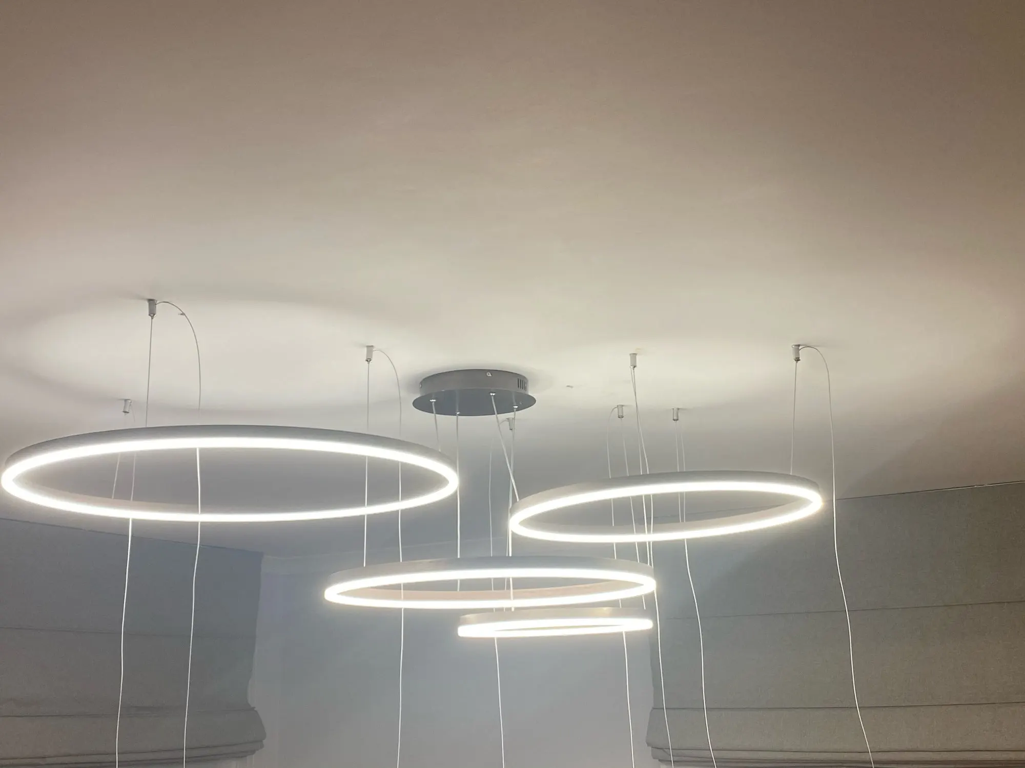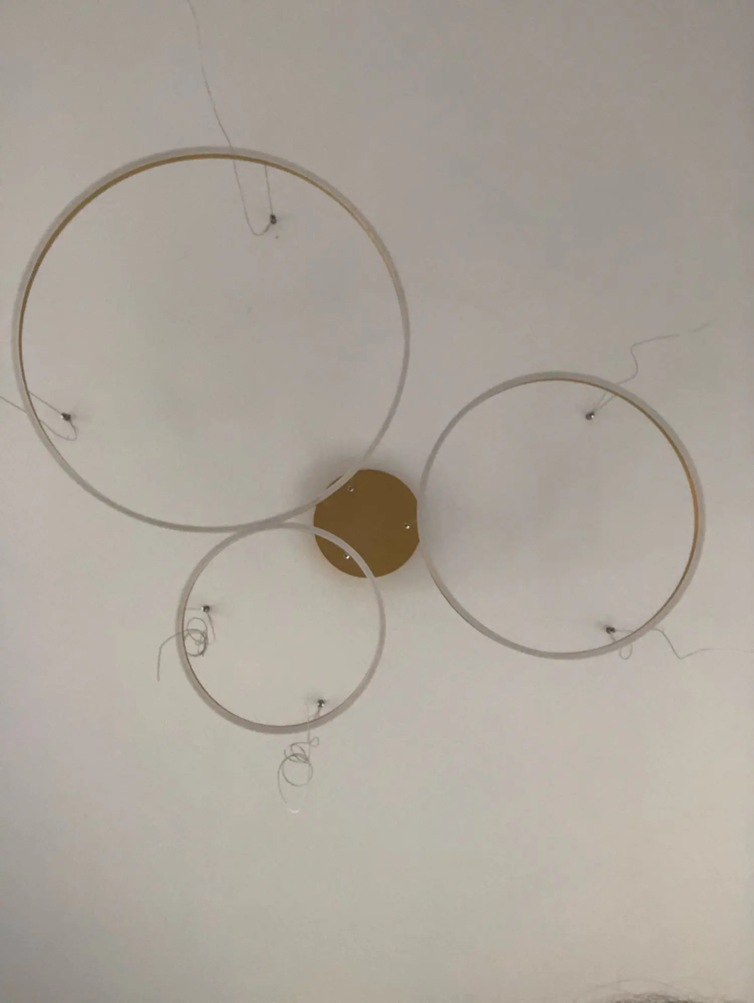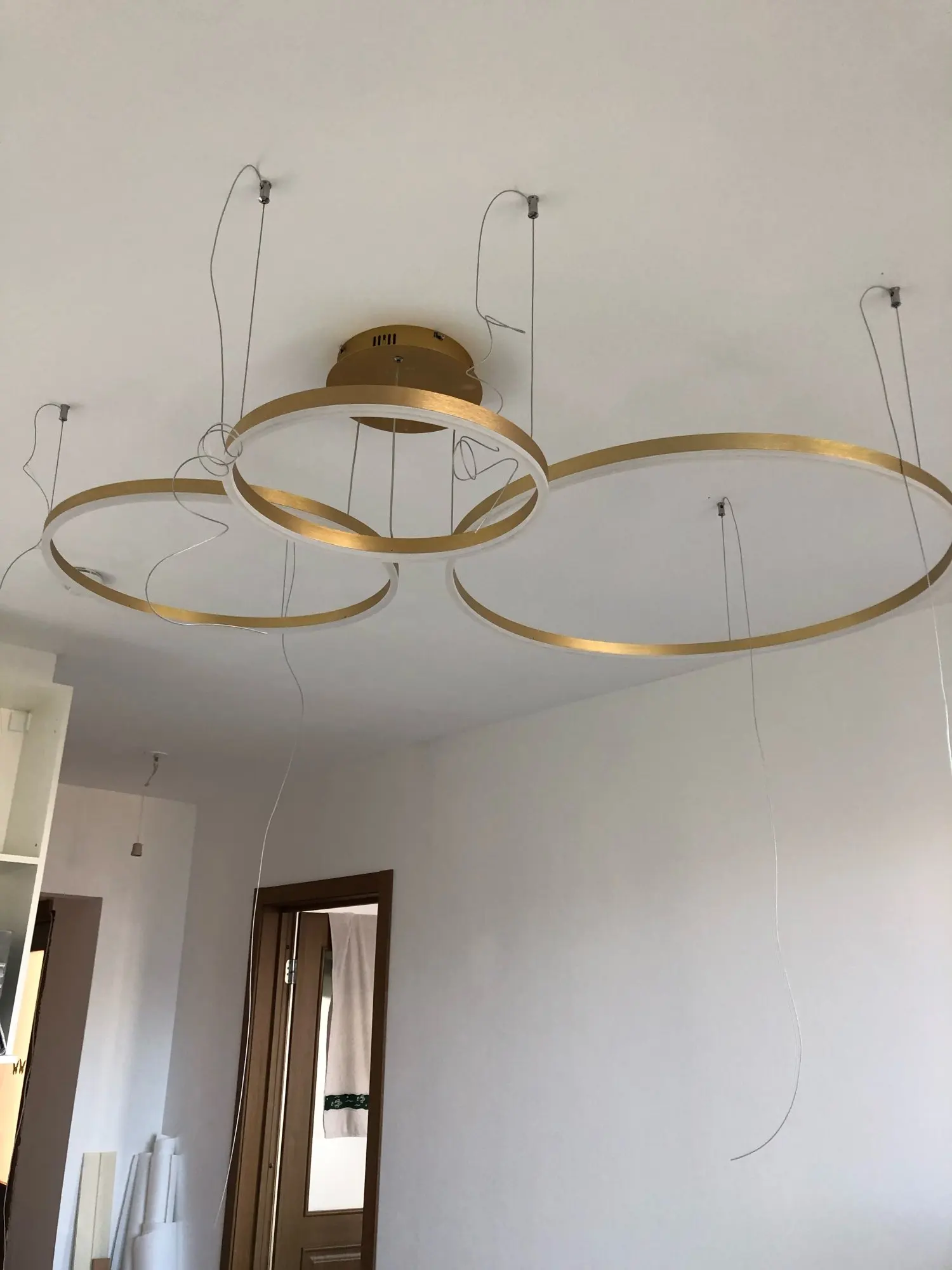 Отличная люстра!!! Как на картинке 100% Чтобы повесить пришлось сделать макет (круги) из картона(упаковка из под люстры) с точным размером дисков, расположением друг под другом и отметками где находятся крепления-тросы. после этого на потолке сделали отметки и просверлили дырки. В итоге все тросы с любой стороны смотрятся парралельного друг другу без перекоса и точка крепления троса на люстре точно совпадает с точкой крепления на потолке, ни миллиметра в сторону.