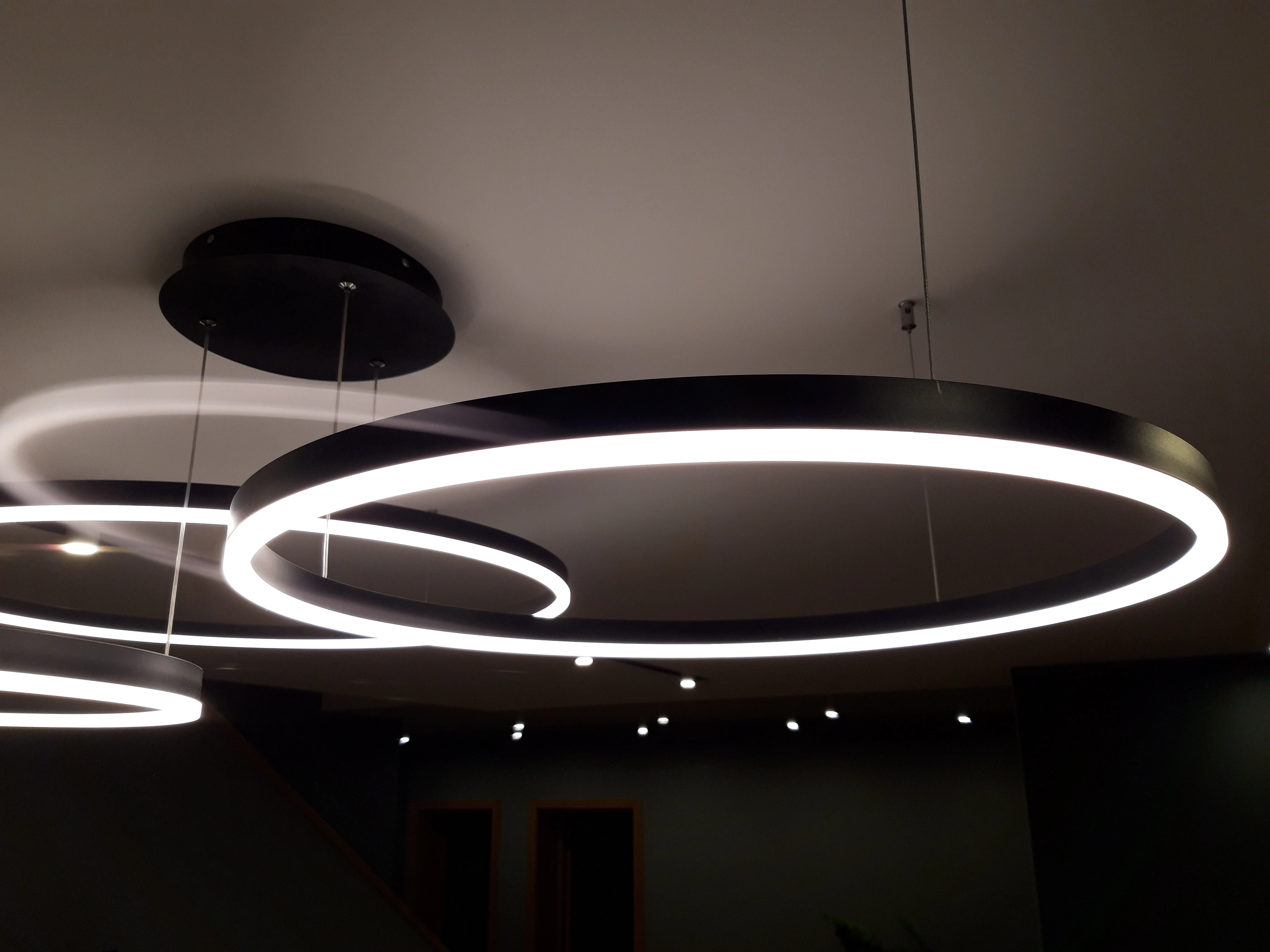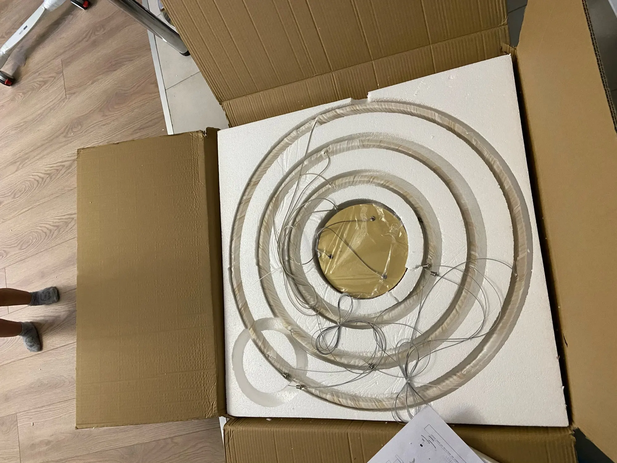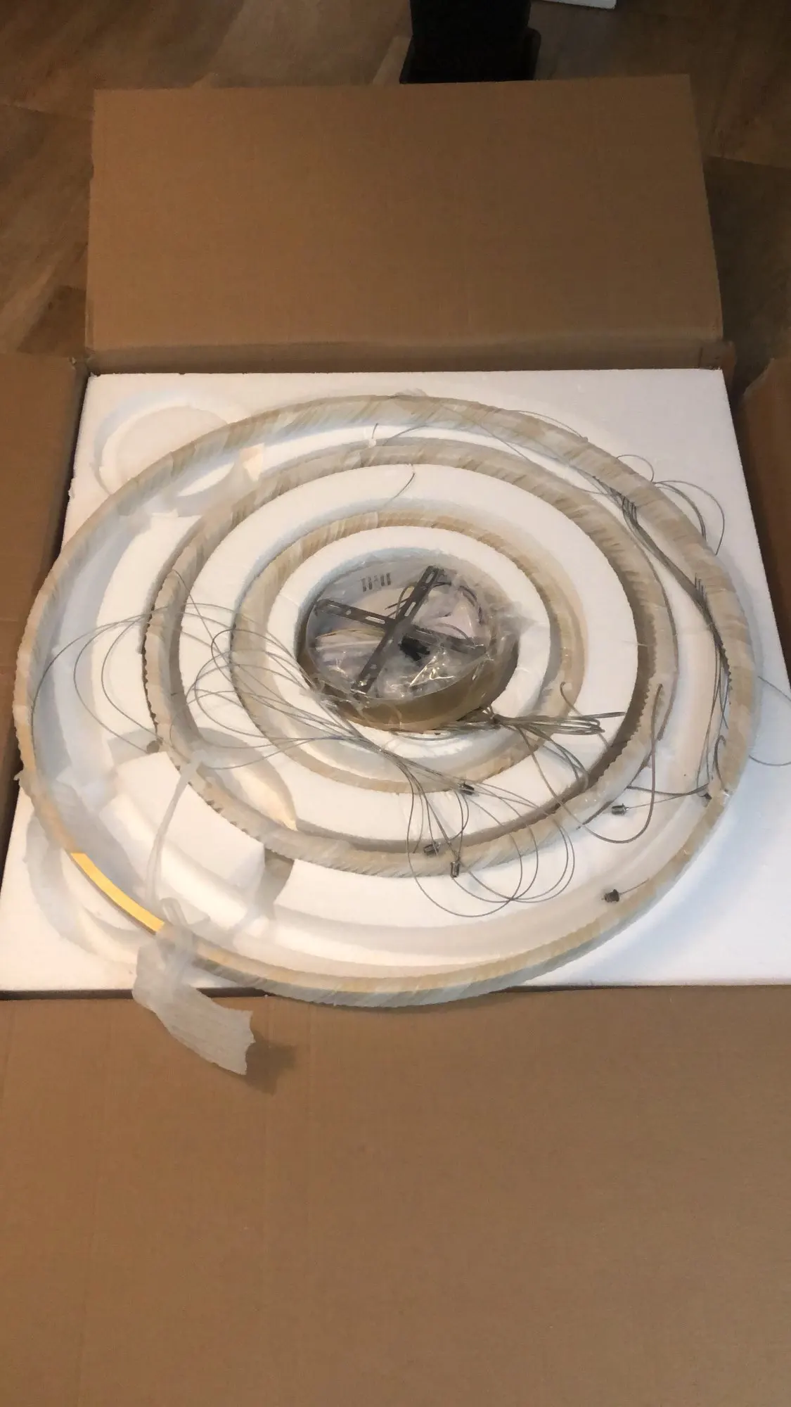 Отличная люстра!!! Как на картинке 100% Чтобы повесить пришлось сделать макет (круги) из картона(упаковка из под люстры) с точным размером дисков, расположением друг под другом и отметками где находятся крепления-тросы. после этого на потолке сделали отметки и просверлили дырки. В итоге все тросы с любой стороны смотрятся парралельного друг другу без перекоса и точка крепления троса на люстре точно совпадает с точкой крепления на потолке, ни миллиметра в сторону.