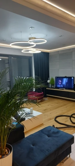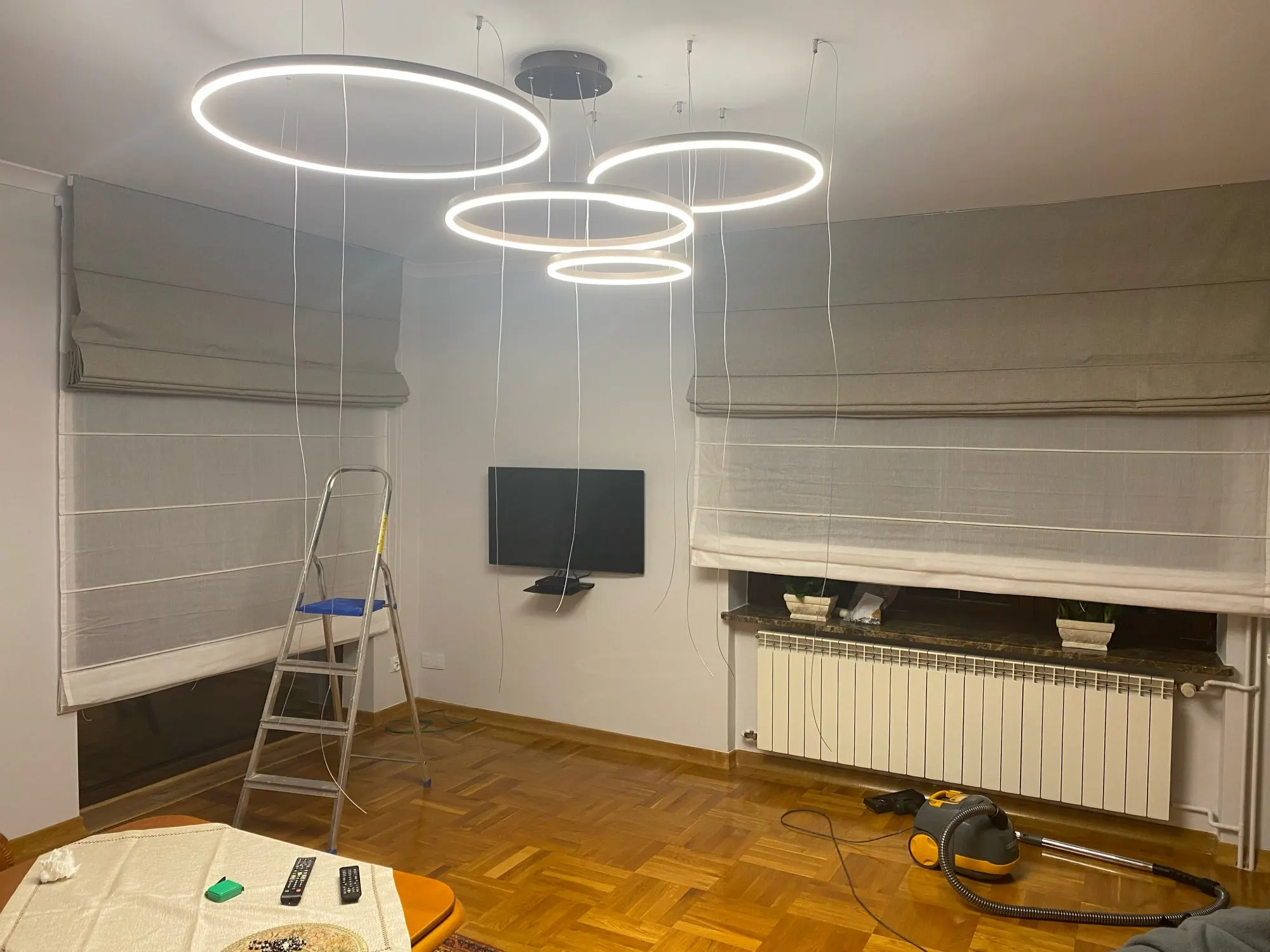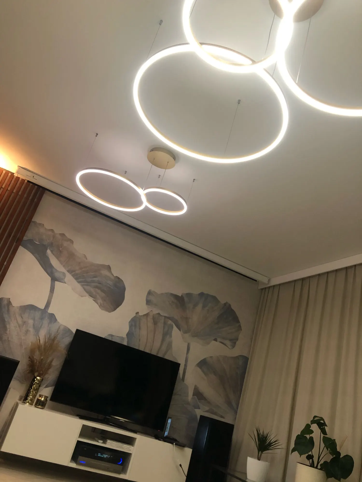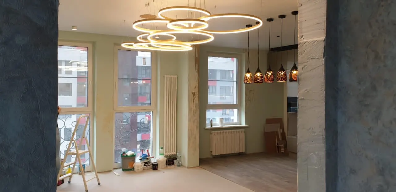 Выглядит очень стильно, на 25м2 взяли диаметр 40/60/80, освещения достаточно размер подошёл. Советую брать с пультом переключения, белый свет очень хорошо подходит под пасмурную погоду днём, вечером умиротворяем приятный тёплый свет. В жизни выглядит ещё круче чем на фото