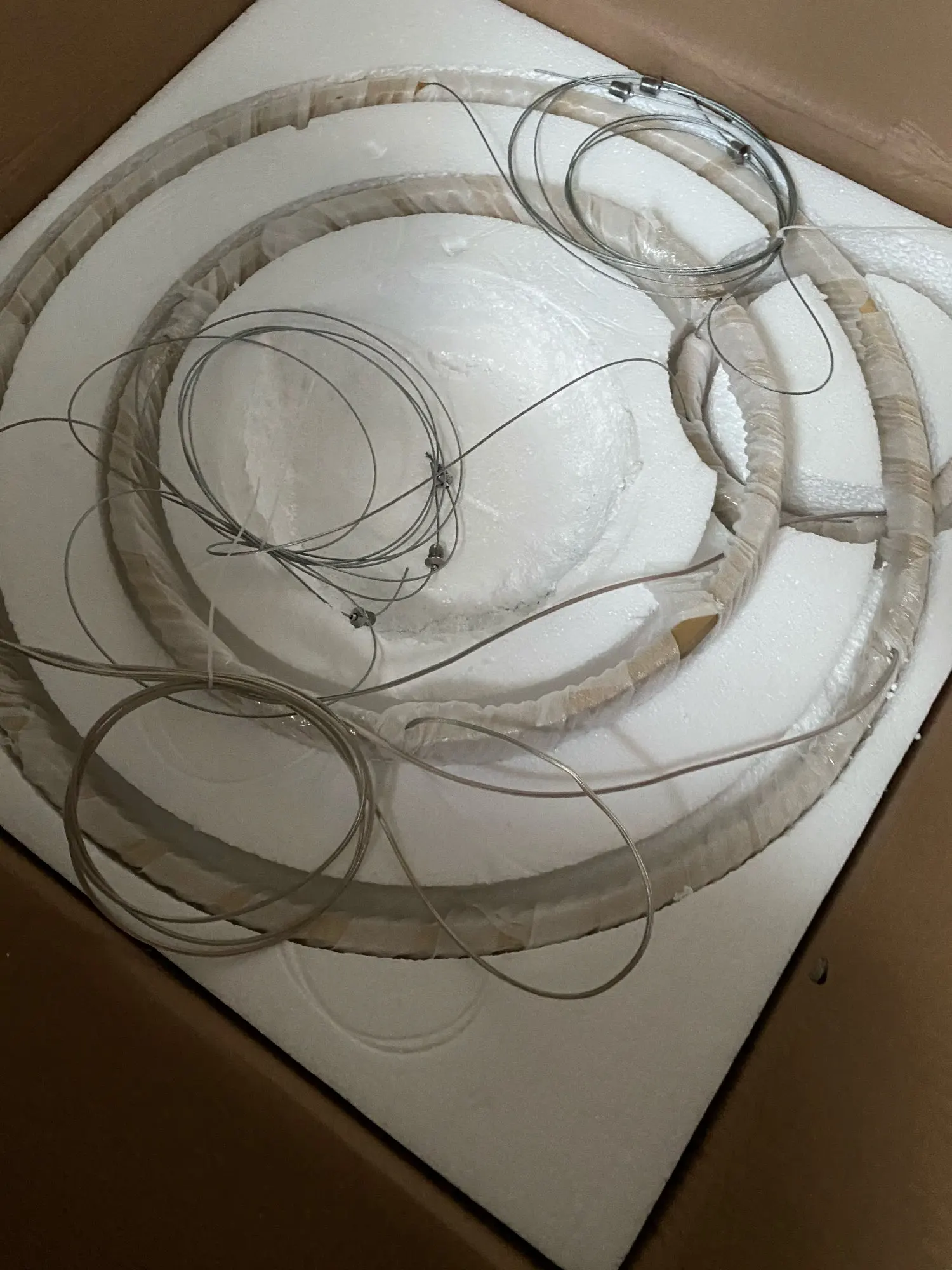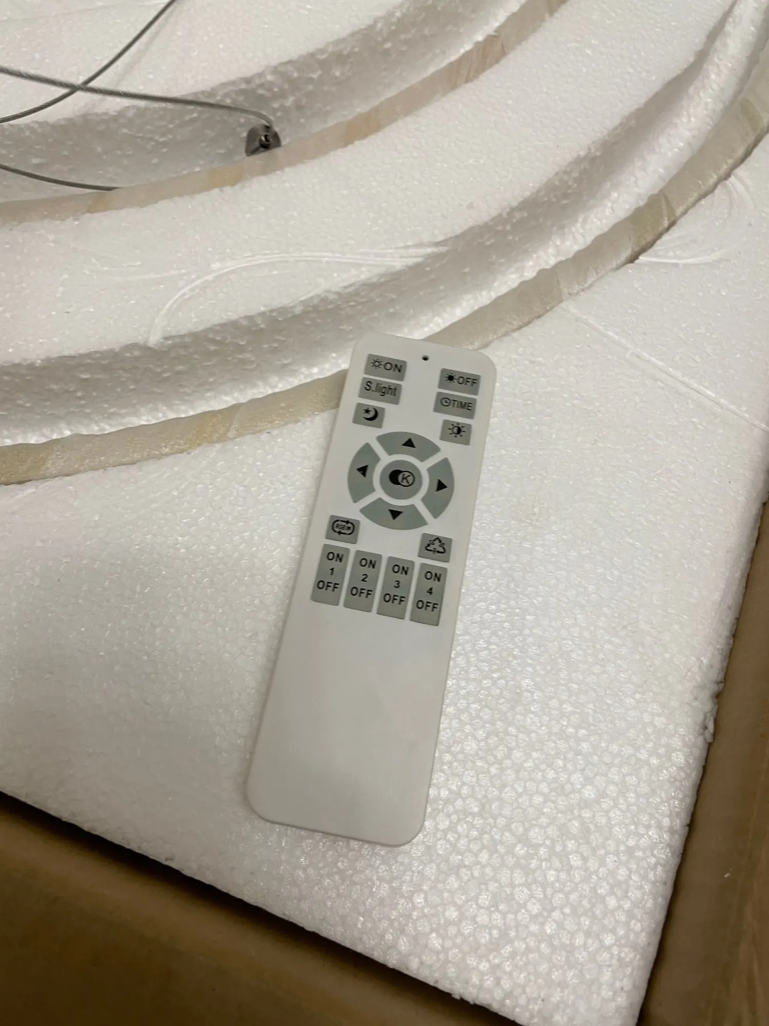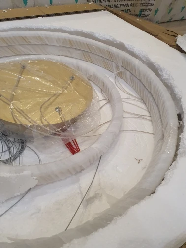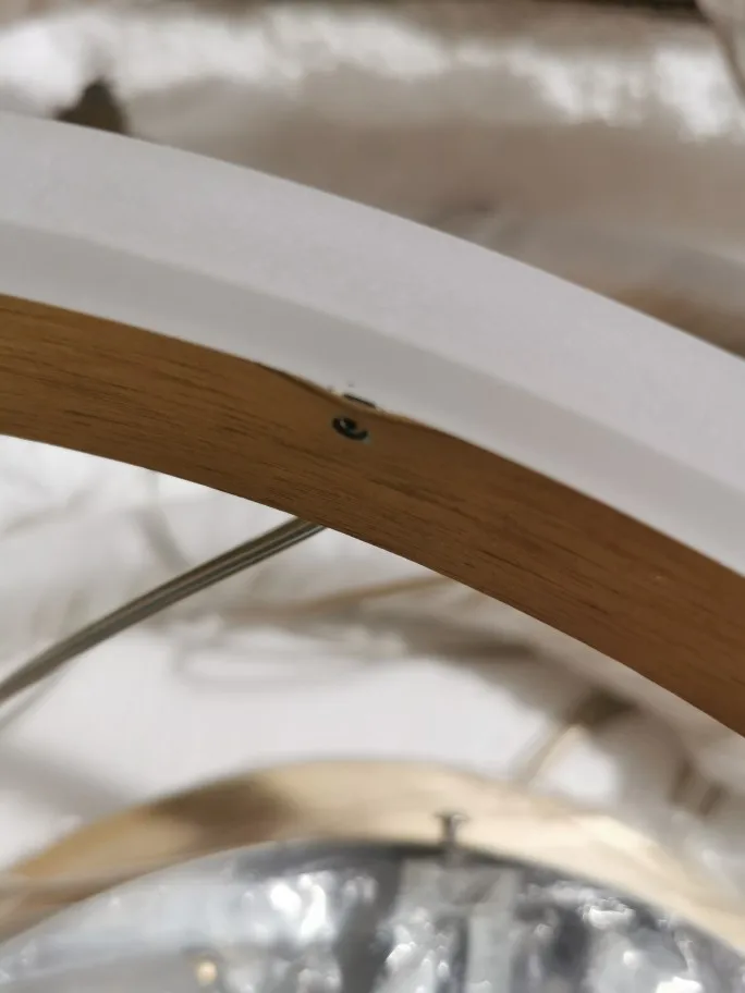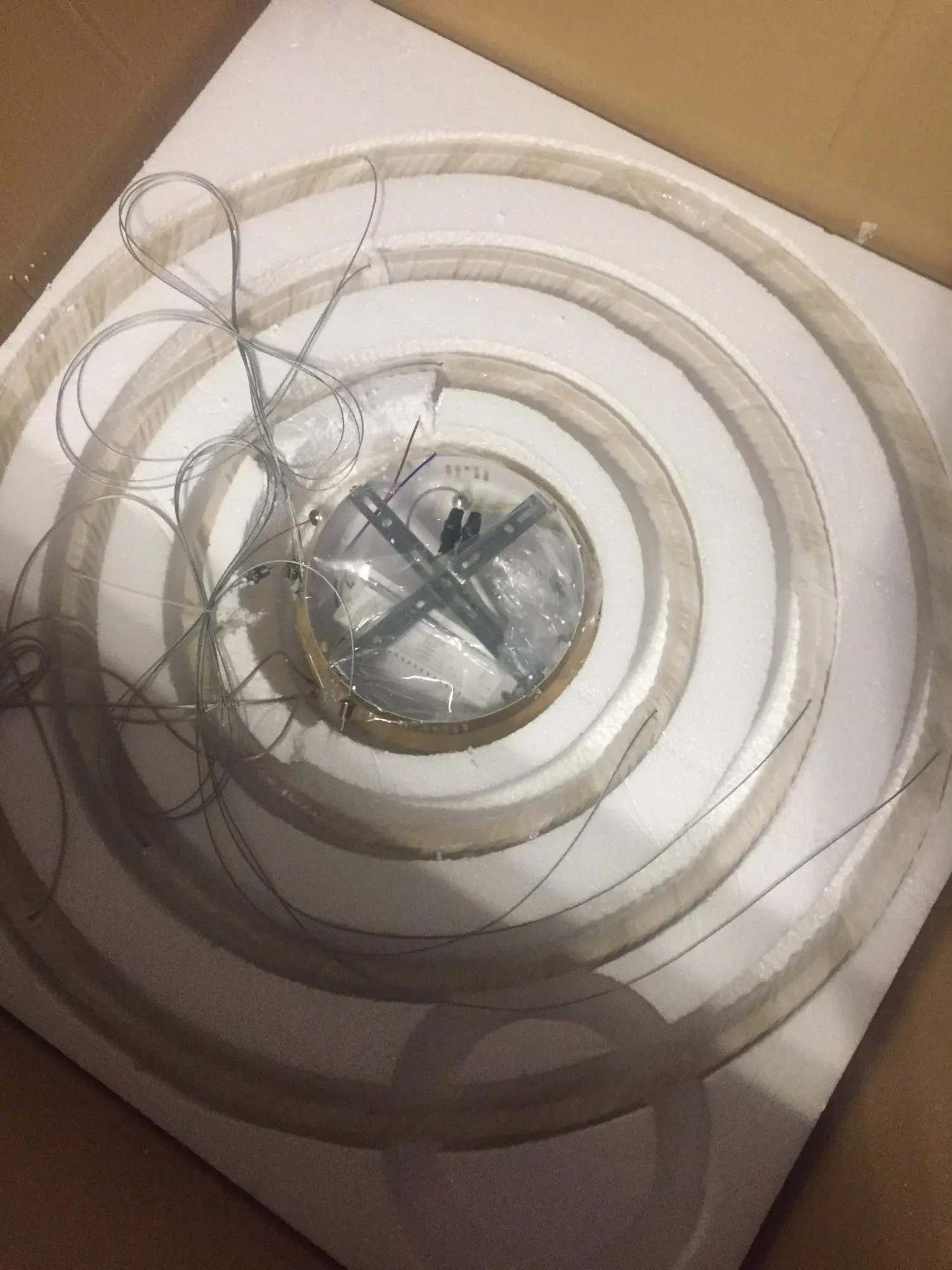 Люстра упакована хорошо. Из недостатков - при ярком тёплом свете просвечивают светодиоды (видно точки) через пластиковую белую накладку люстры