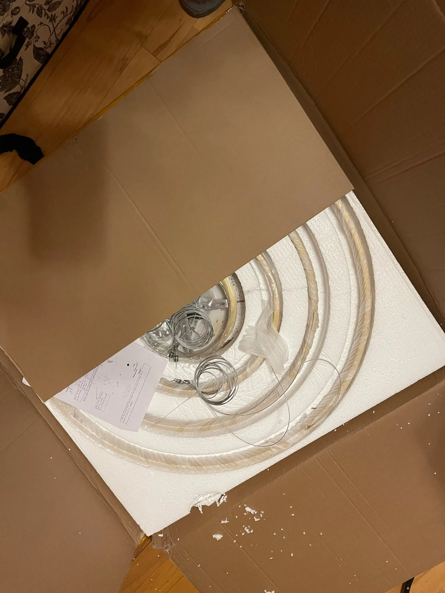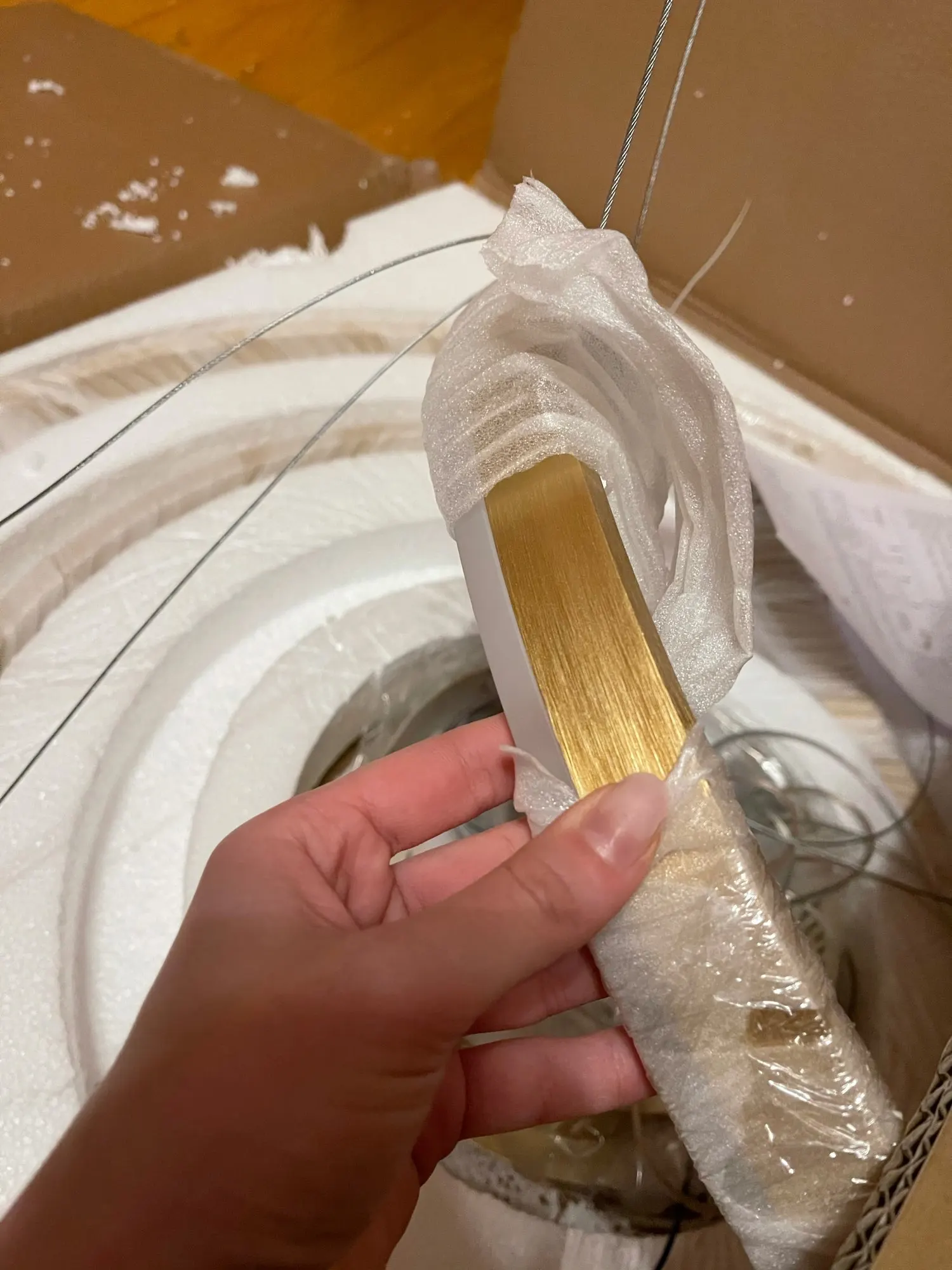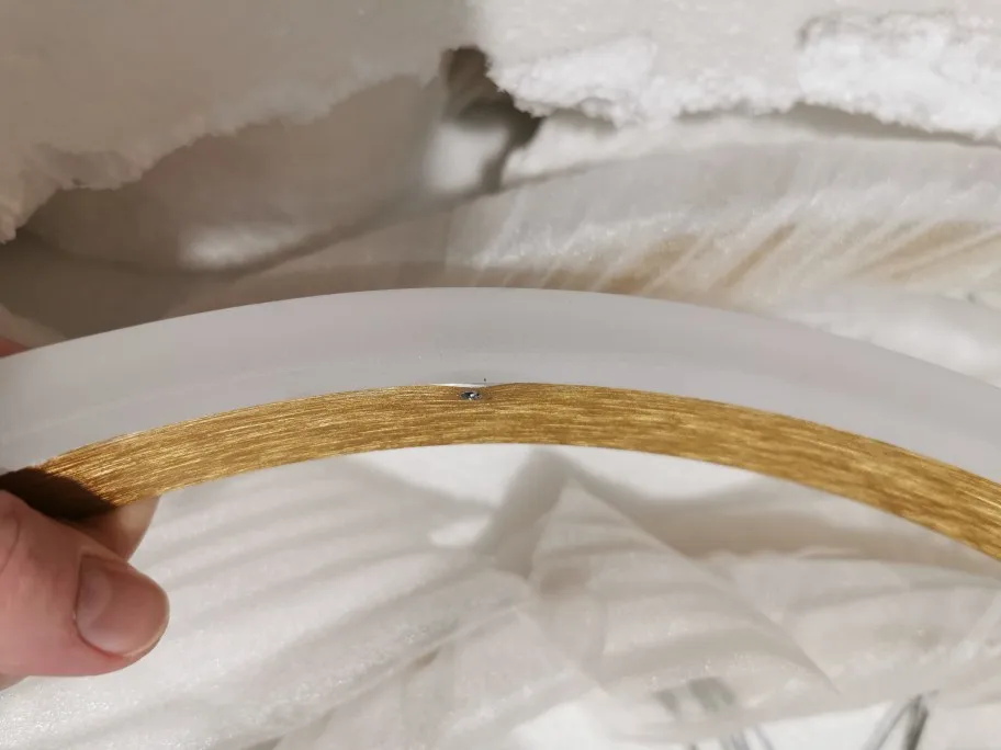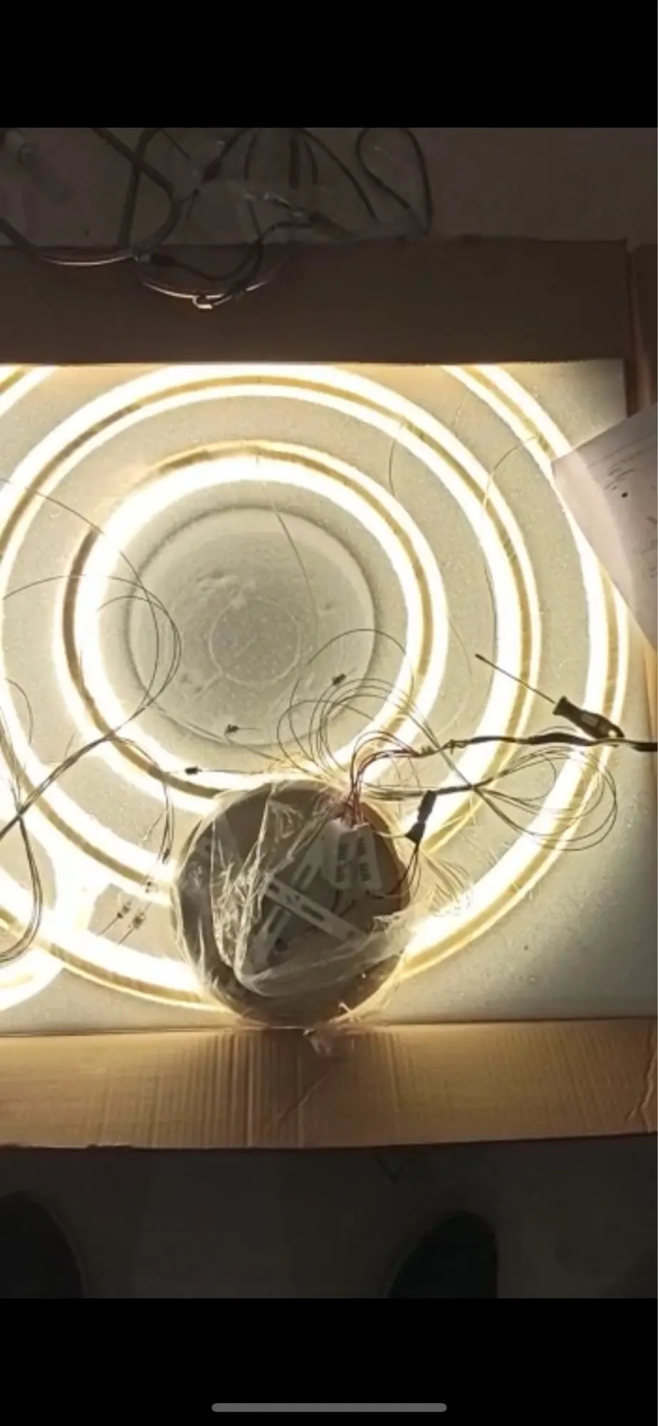 Люстра упакована хорошо. Из недостатков - при ярком тёплом свете просвечивают светодиоды (видно точки) через пластиковую белую накладку люстры