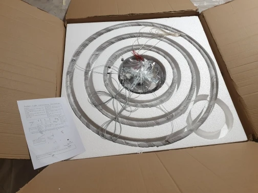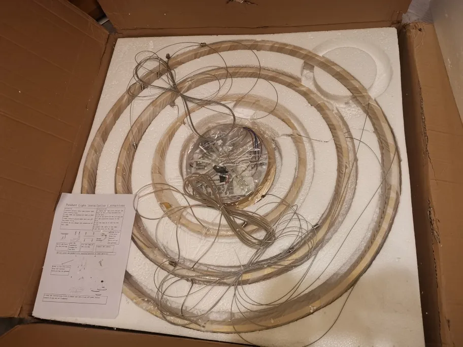 Люстра очень красивая. Я очень доволен. Дает очень сильный свет, рекомендуется выбирать опции с пультом дистанционного управления, чтобы вы могли контролировать световой эффект. Кроме того, вы можете выбрать цвет света. Доставка без каких-либо проблем. В Польше доставка курьером DPD, около 1,5 месяца заказа. Упакуйте будущее без каких-либо повреждений.