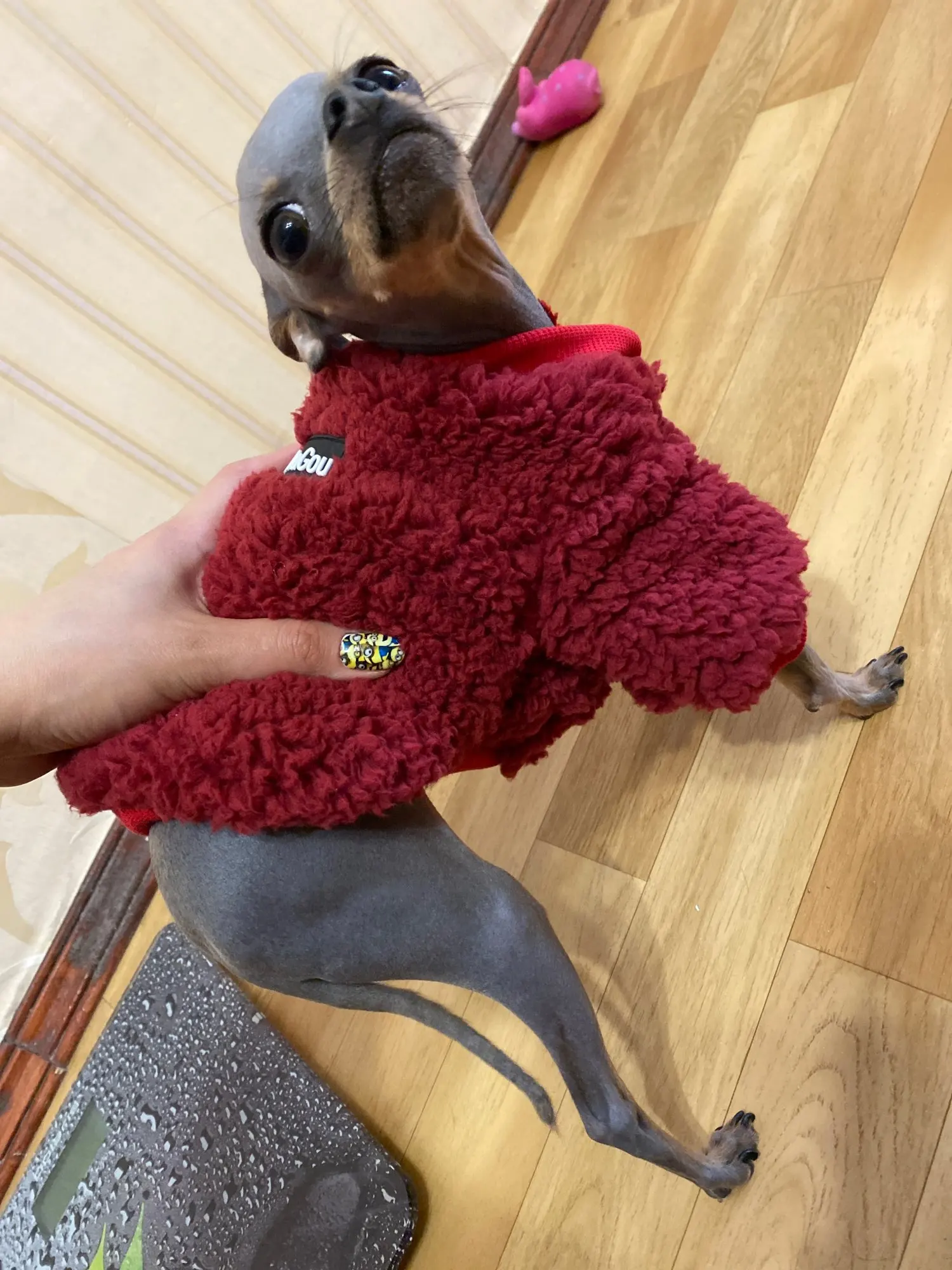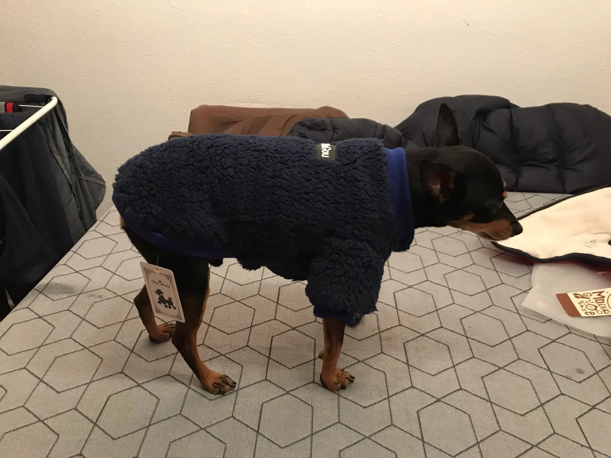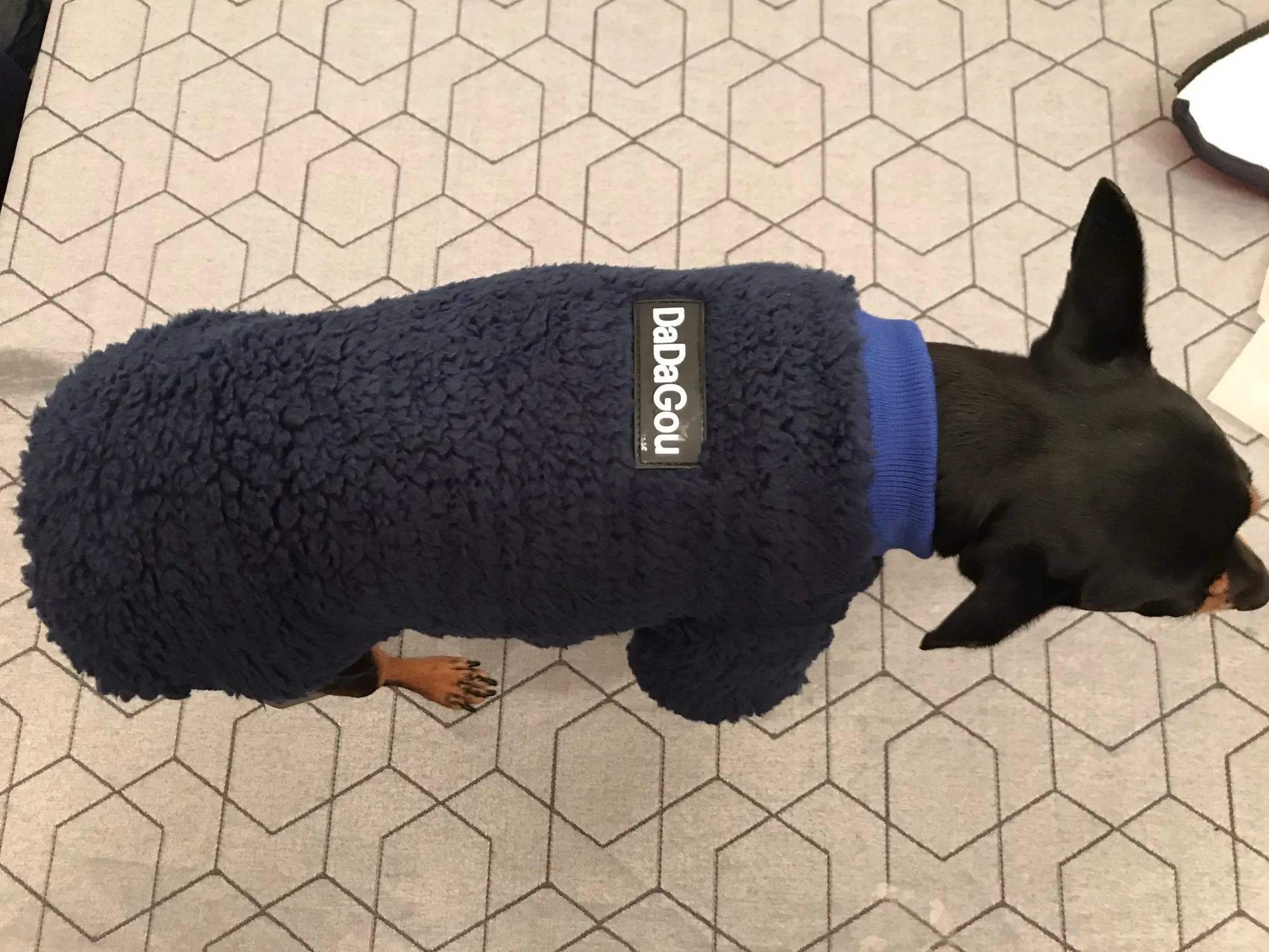 Очень толстый и мягкий пальто. Я взял размер xl для моей 5-килограммовой сломанной собаки Джек Рассел, он немного большой, размер L был бы достаточно.