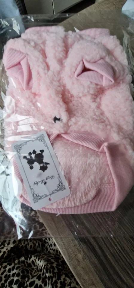 Очень мягкая и пухнатая кофточка. Материал, правда, чистая синтетика. На мальтийскую болонку весом 5кг. подошла отлично. Одеваем через голову, смысла в кнопках снизу не вижу. Цвет как на фото, и доставка в Минск порадовала - всего три недели.