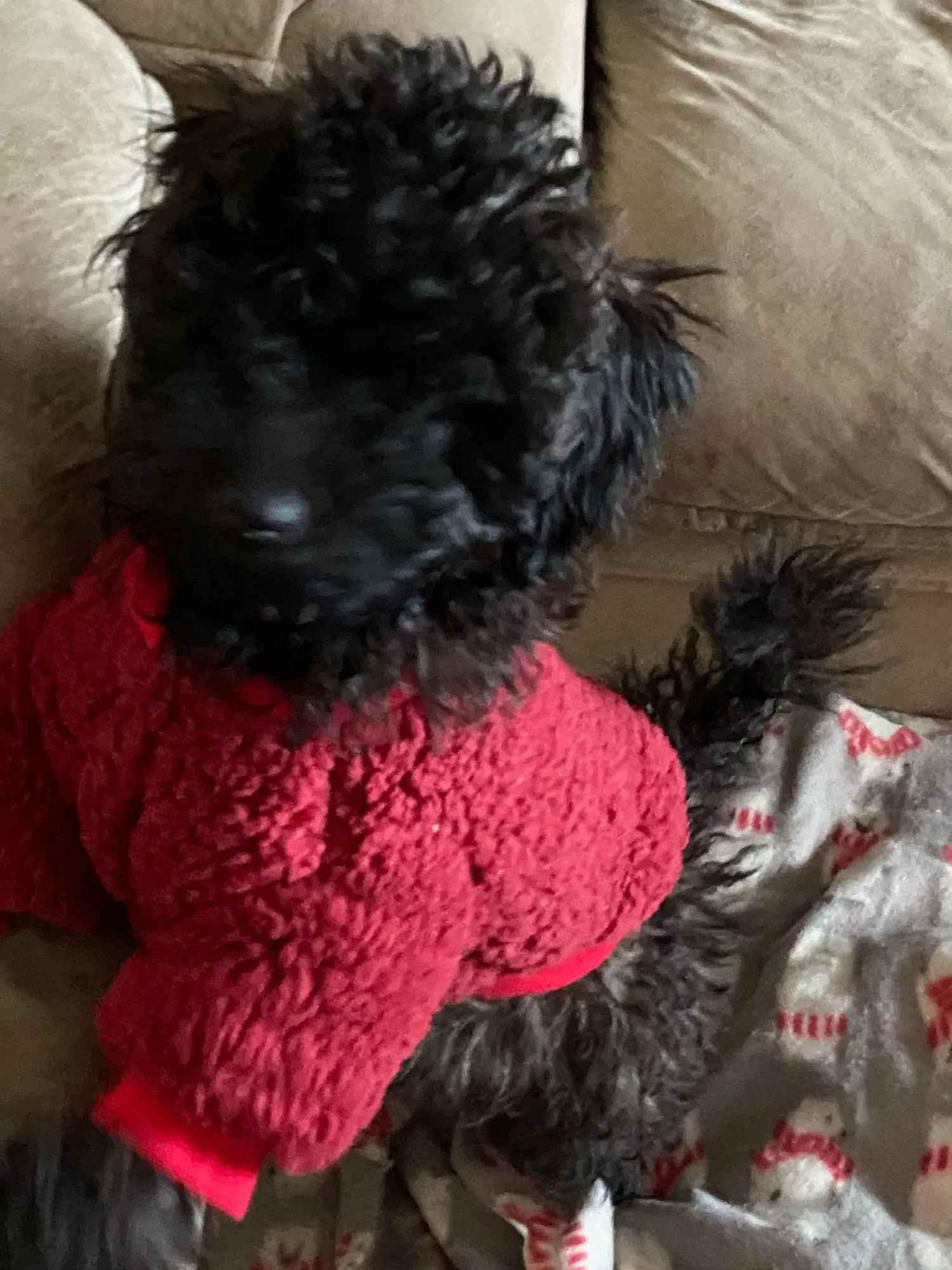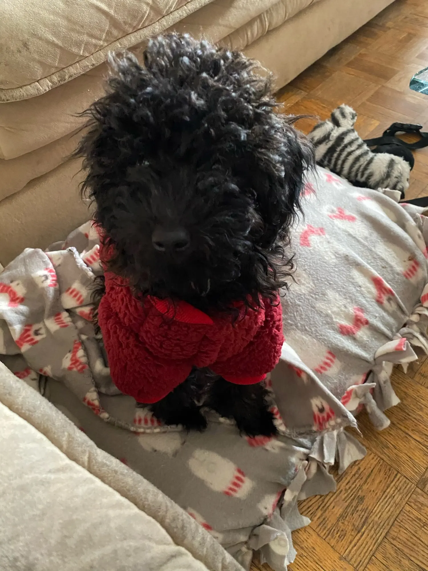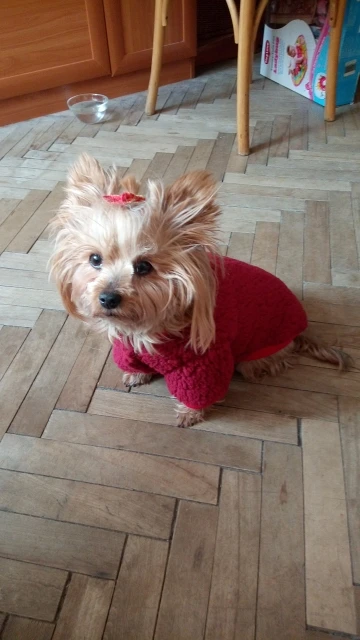 Йорку 4 месяца великоват. На фото на сайте выглядит лучше. Теплая, хорошая кофточка. С продавцом не общалась.
