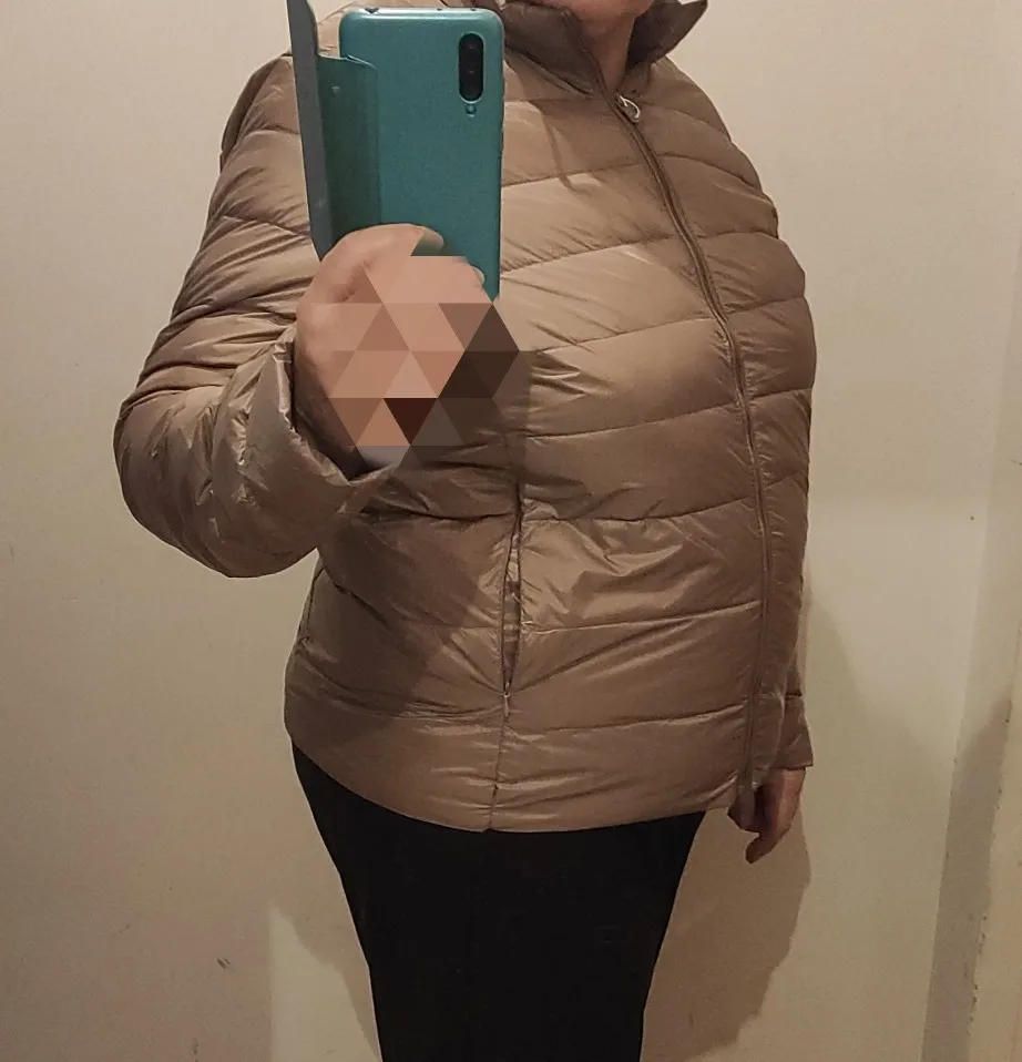 Курточка дошла за 17 дней. Невесомая, лёгкая. Не особо пушится, смотрится плоской что-ли. В целом заказом довольна. Качество неплохое, пару ниток на спине обрезала. 5xl на российский 56 впритык, застёгивается, но в груди тесно. Однозначно надо бы 6xl, но такого размера не было в этом магазине. Носить можно на очень тоненькую кофту или майку. А в общем все хорошо! Спасибо продавцу! И спасибо всем, кто пишет отзывы, они очень помогают