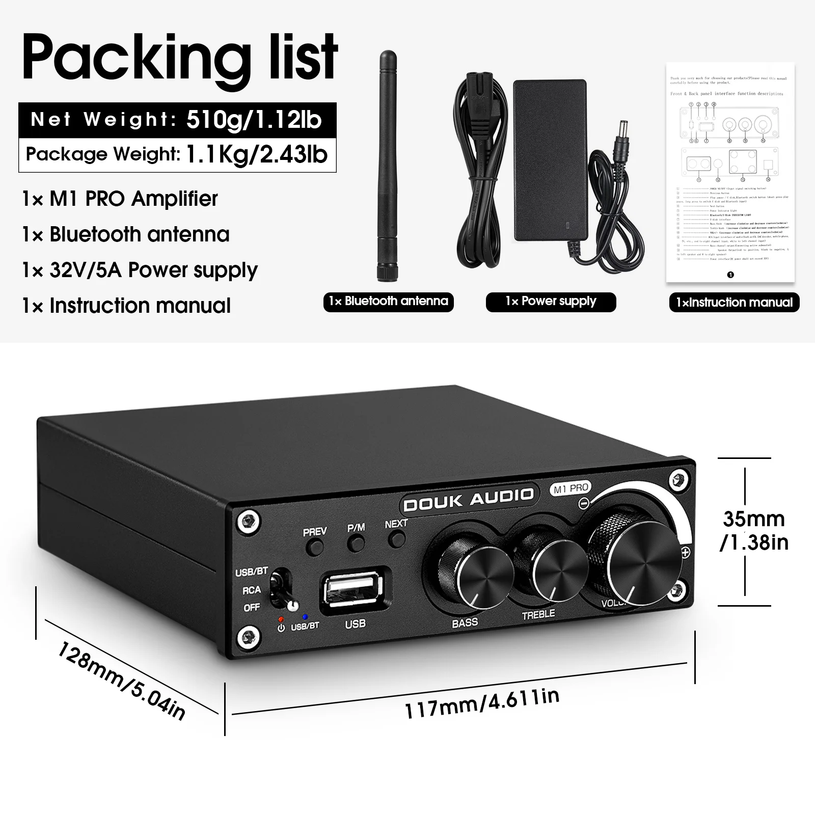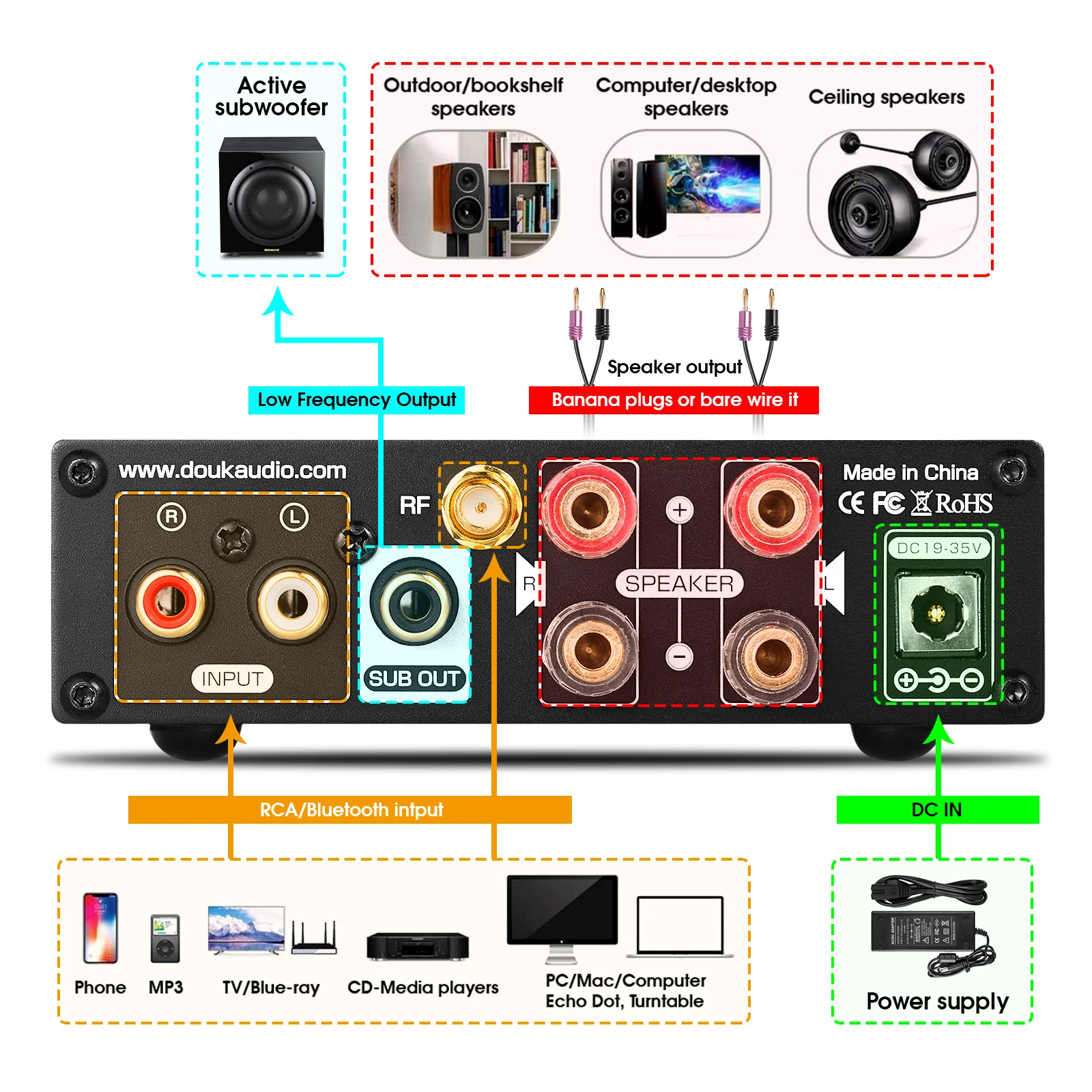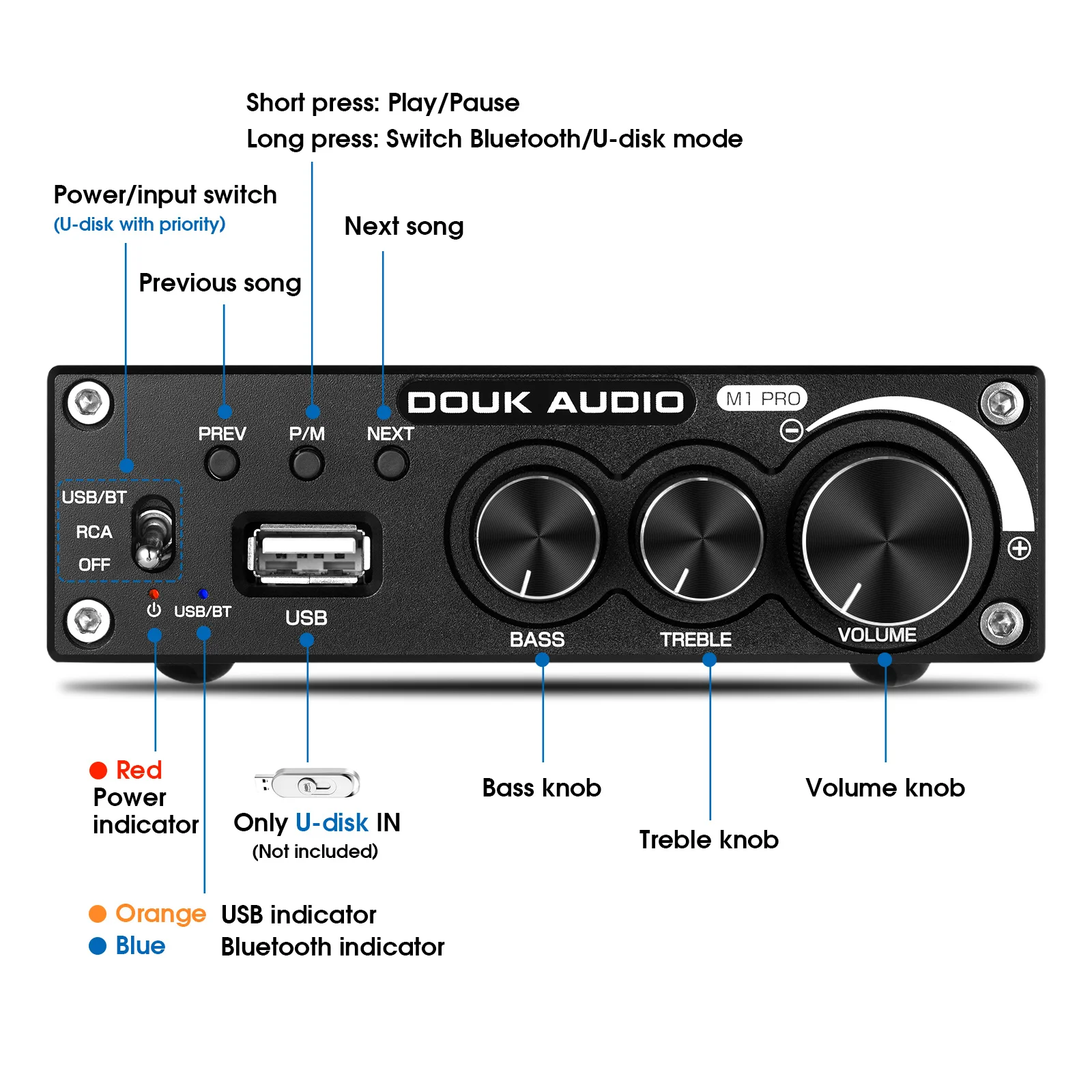 Усилитель мощности Douk audio, Bluetooth 5,0, 2,0 каналов, сабвуфер, усилитель, Настраиваемые высокие басы, USB музыкальный плеер без потерь, 320 Вт