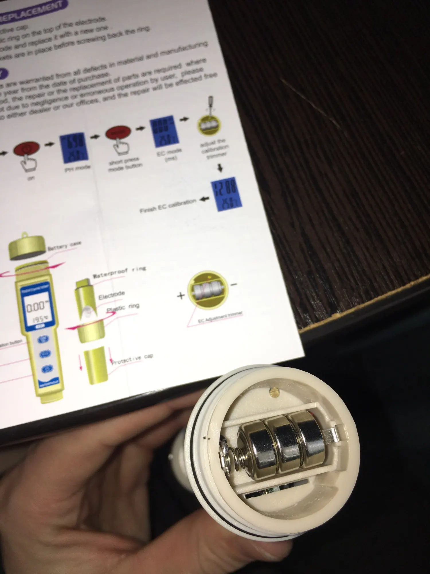 Всем доброго времени суток) это просто пушка! Заказал: 06.12 19:55, получил 09.12 11:00. Более быстрой доставки у меня ещё не было, Мск. Соответствует описанию, в комплекте батарейки, приятный момент) только 1 момент, почему-то батарейки пришлось вставить в противоположеную сторону от инструкции (на фото видно), но вроде работает, куплю раствор, откалибрую и дополню, пока всем доволен, рекомендую! Конечное мнение будет зависеть от точности