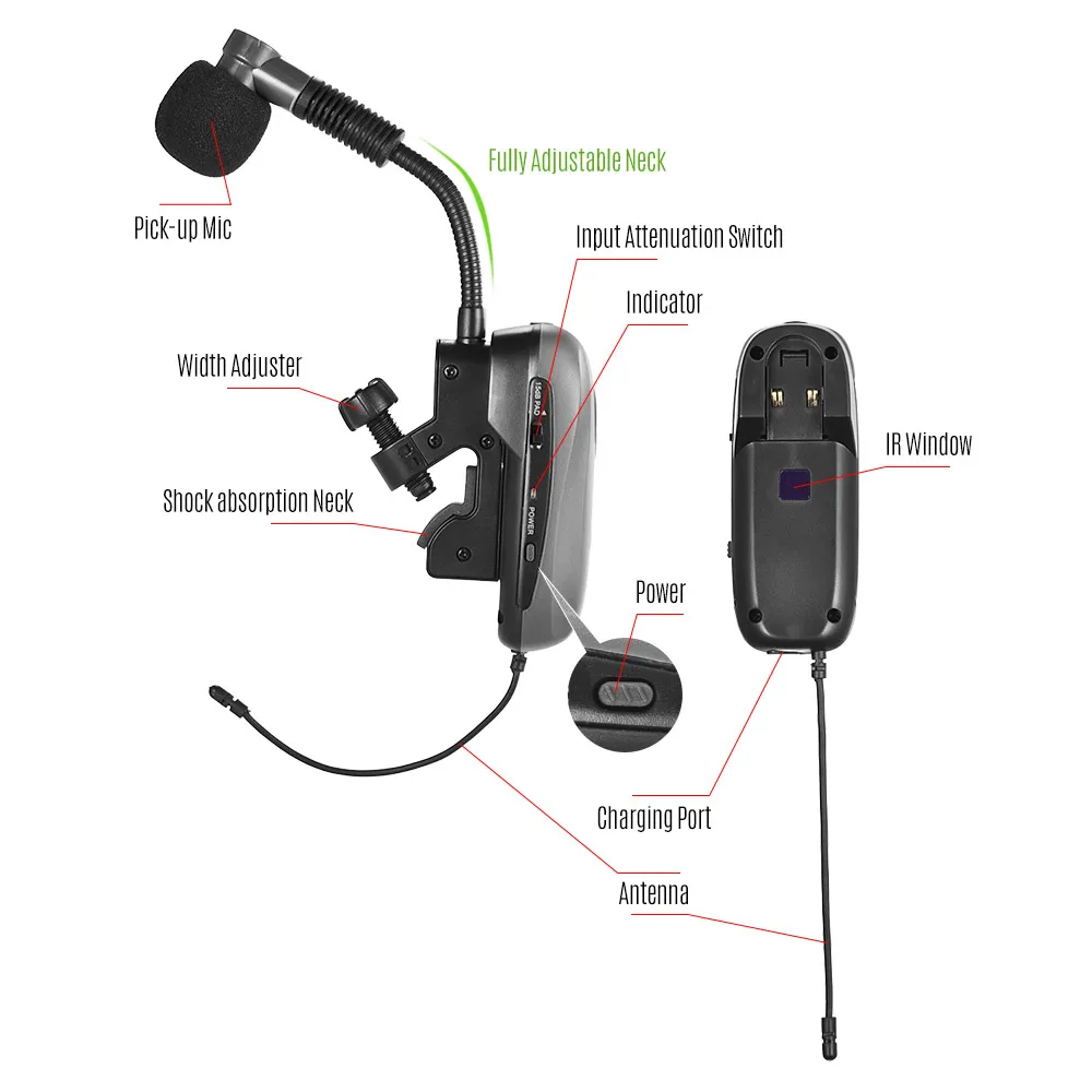 Профессиональный беспроводной приемник-передатчик с микрофоном специально для саксофона, а также для других ветровых инструментов, если доступны размеры зажима.