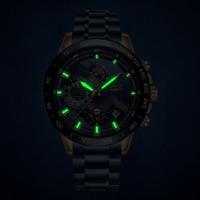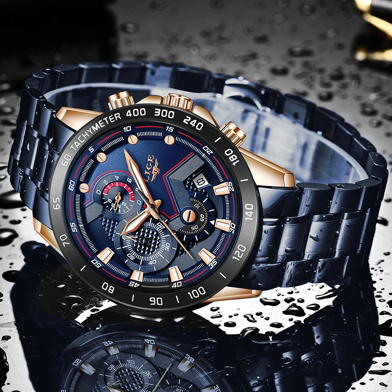 Часы наручные LIGE Мужские кварцевые, модные брендовые Роскошные деловые полностью стальные водонепроницаемые в стиле милитари, с коробкой