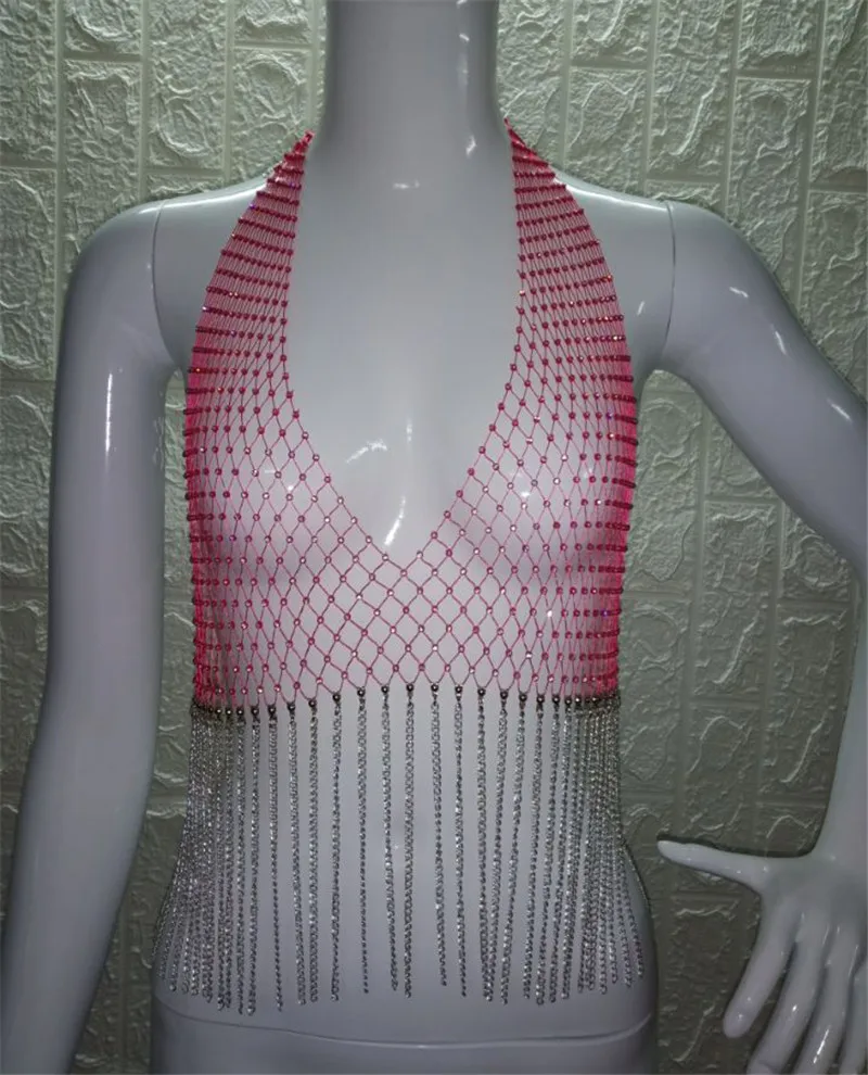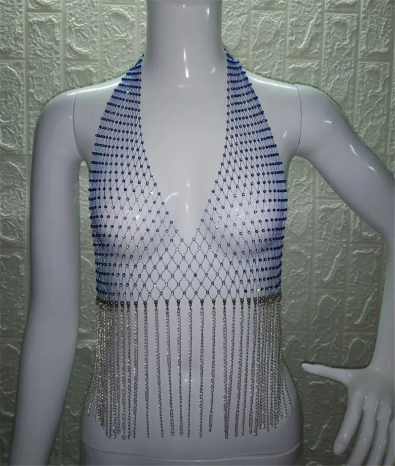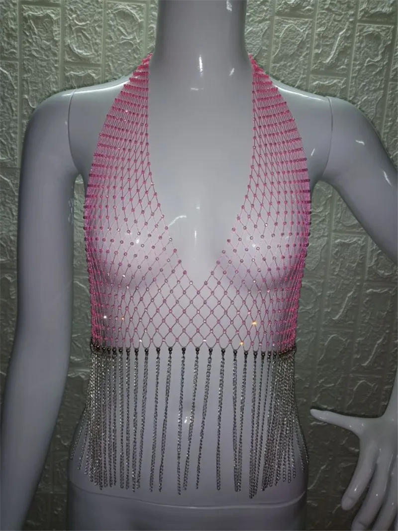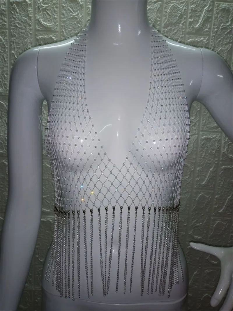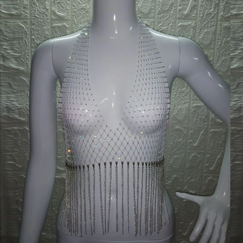 Блестящий сетчатый кроп-Топ Стразы с глубоким V-образным вырезом, прозрачный ажурный топ со стразами, цепочкой и кисточками, топ для вечевечерние и клубов
