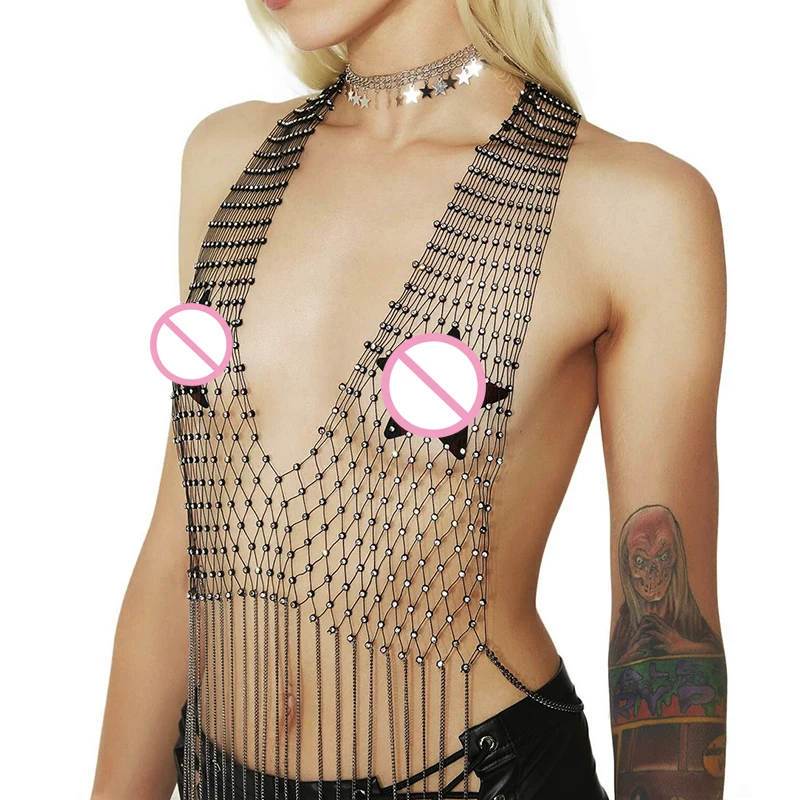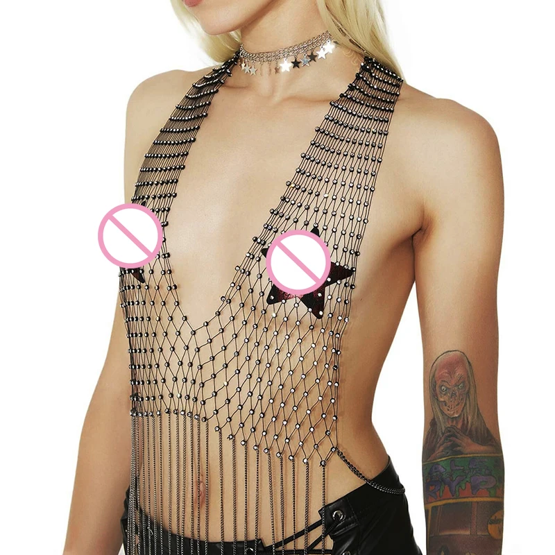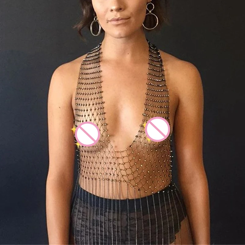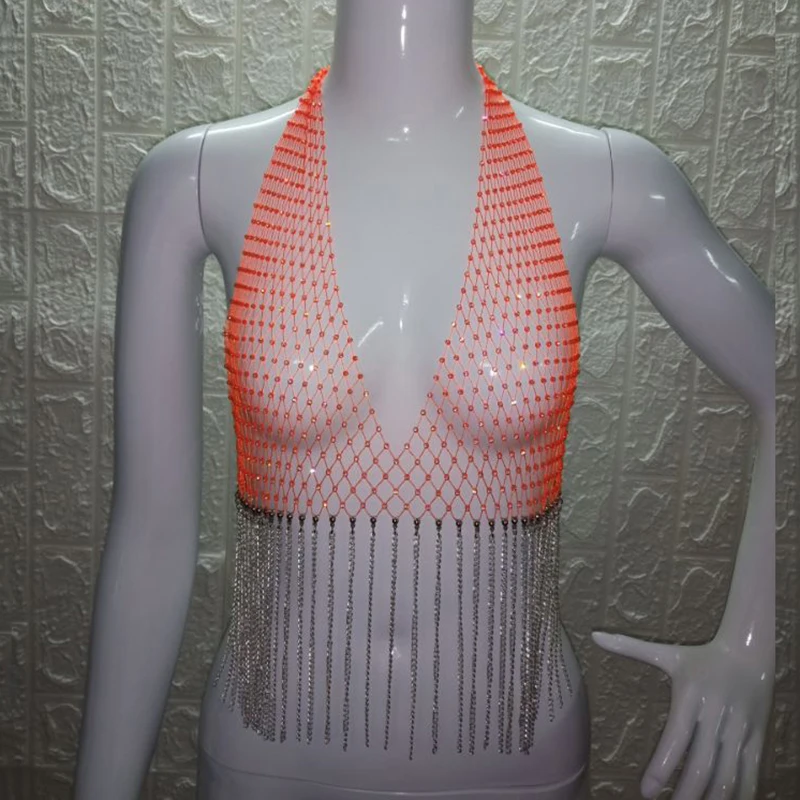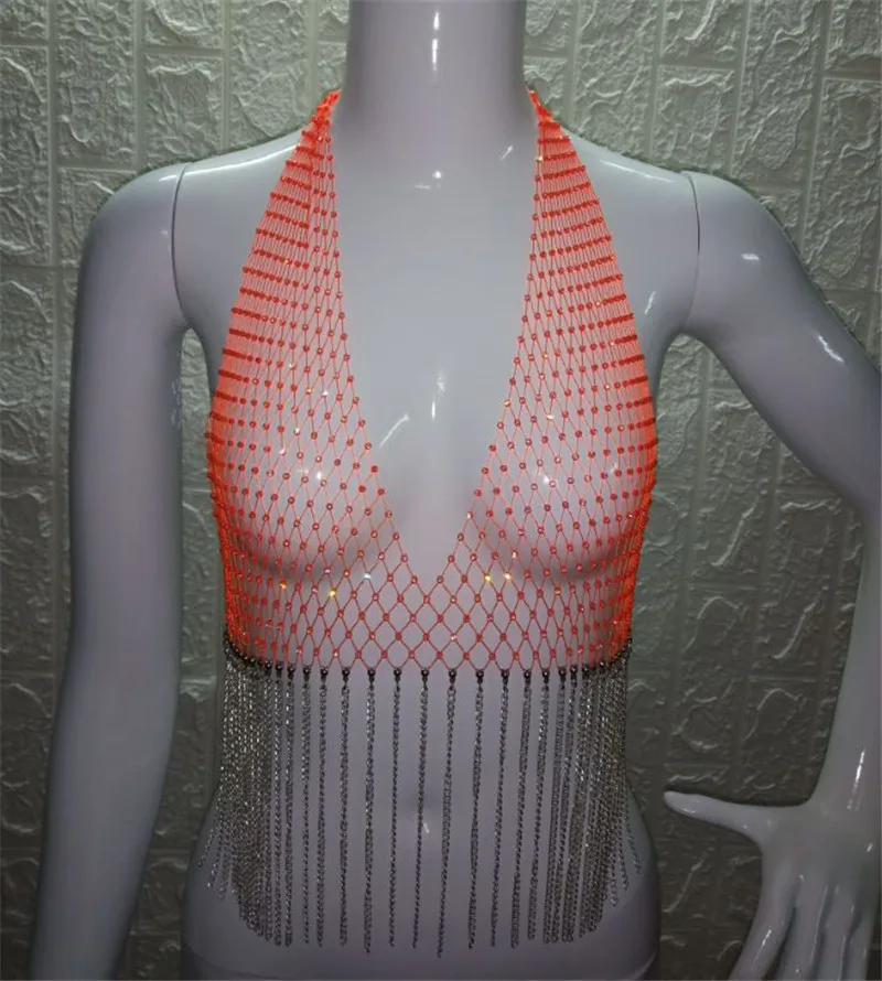 Блестящий сетчатый кроп-Топ Стразы с глубоким V-образным вырезом, прозрачный ажурный топ со стразами, цепочкой и кисточками, топ для вечевечерние и клубов