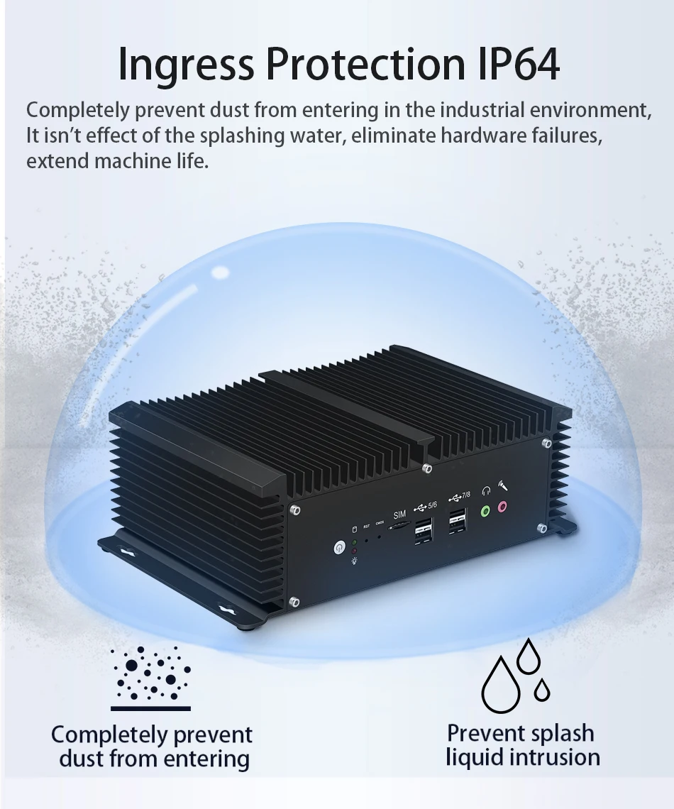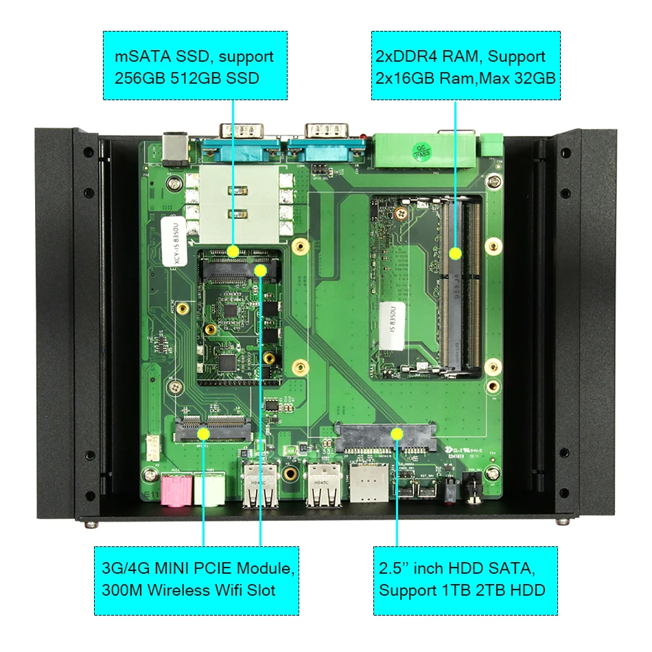 1. Совместим с двойным слотом DDR4 2133/2400 МГц памяти, максимум до 32 Гб 2. Поддержка двойной 2,5 дюймов HDD SATA и mSATA, а также с 3G/4G модуль mPCIE. 3. Два RS232/422/485 последовательный порт локальной сети) и 2 * Intel 211at гигобитный сетевой контроллер 4. Безвентиляторный пассивный Вентилятор охлаждения с бортовой алюминиевый радиатор 5. Поддержка виртуализации, wake-on-LAN, устройство защиты от перегрузки автоматически поддерживает функцию. 6. Интерфейс ПК: 4 * USB2.0, 4 * USB3.0, 2 * LAN, VGA, HDMI, WI-FI, слот для sim-карты, 1 * GPIO, MIC/SPK 7. Поддержка Windows pro/домашний 8/10, Linux Ubuntu (убу́нту-операционная система) и т. д 8. IP64 защитный ранг, поддержка 7x24hours рабочих