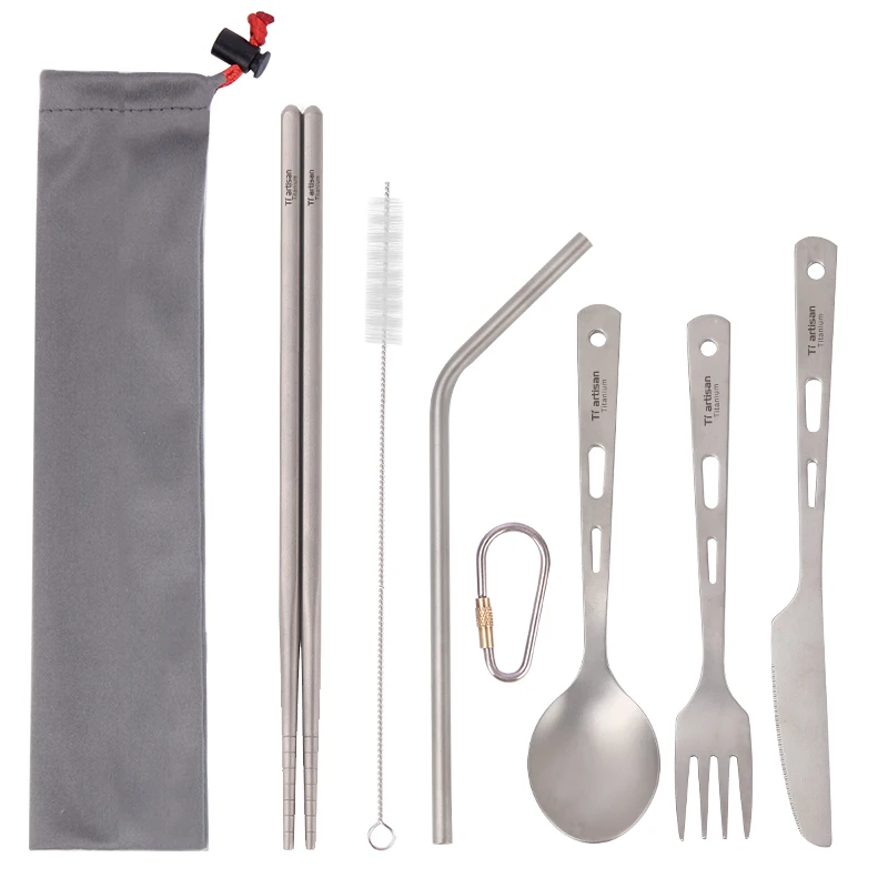 Спецификация набора столовых приборов: вы получаете титановую ложку для ножей, вилку, палочки для еды, солому в этом наборе кухонной утвари для путешествий. Нож 7,3 "/18,5 см, вилка 6,3"/16 см, ложка-6,5 "/16,5 см, солома, is19.5cm, палочки дозирующая детская ложка для is23cm по длине. Также с бесплатной щеткой и кольцом для подключения столовых приборов. Они полностью матовые.