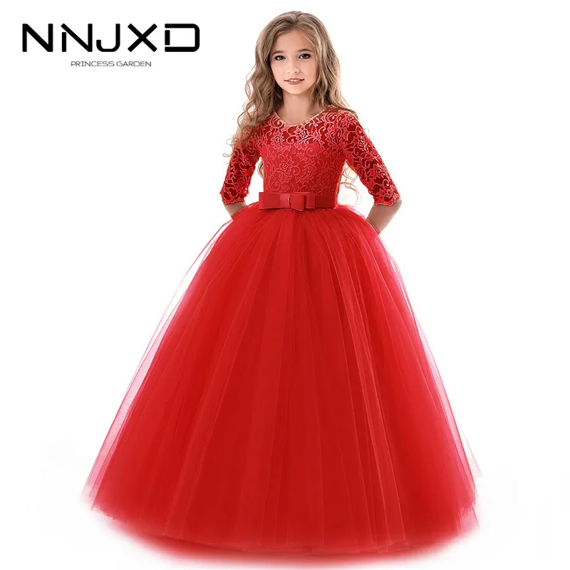 Красное рождественское платье для детей Новогоднее платье для девочек Одежда для свадьбы, дня рождения вечернее платье на выпускной зимние Тюль с длинным рукавом длинное платье