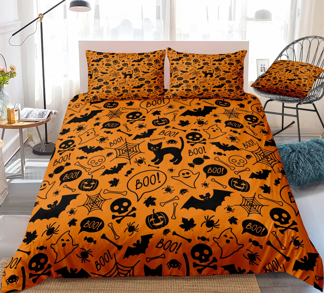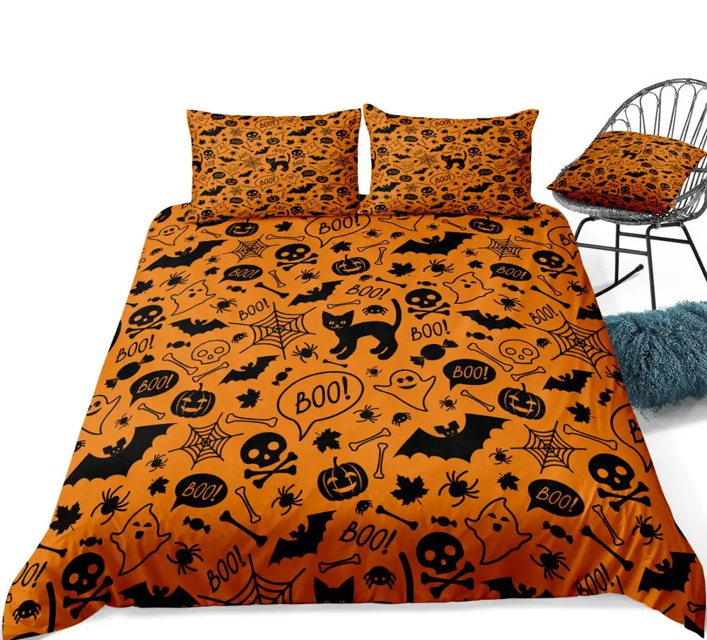 Комплект постельного белья на Хэллоуин из 3 предметов, оранжевое стеганое одеяло с черепом и летучей мыши, пододеяльник, черный комплект с рисунком Человека-паука для мальчиков и девочек
