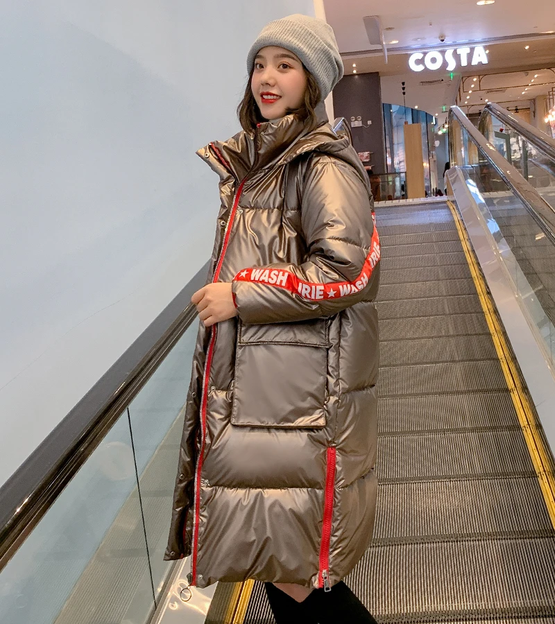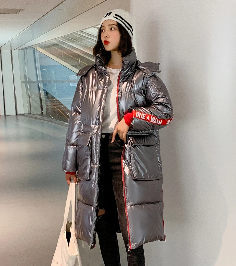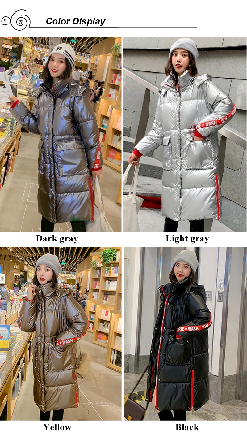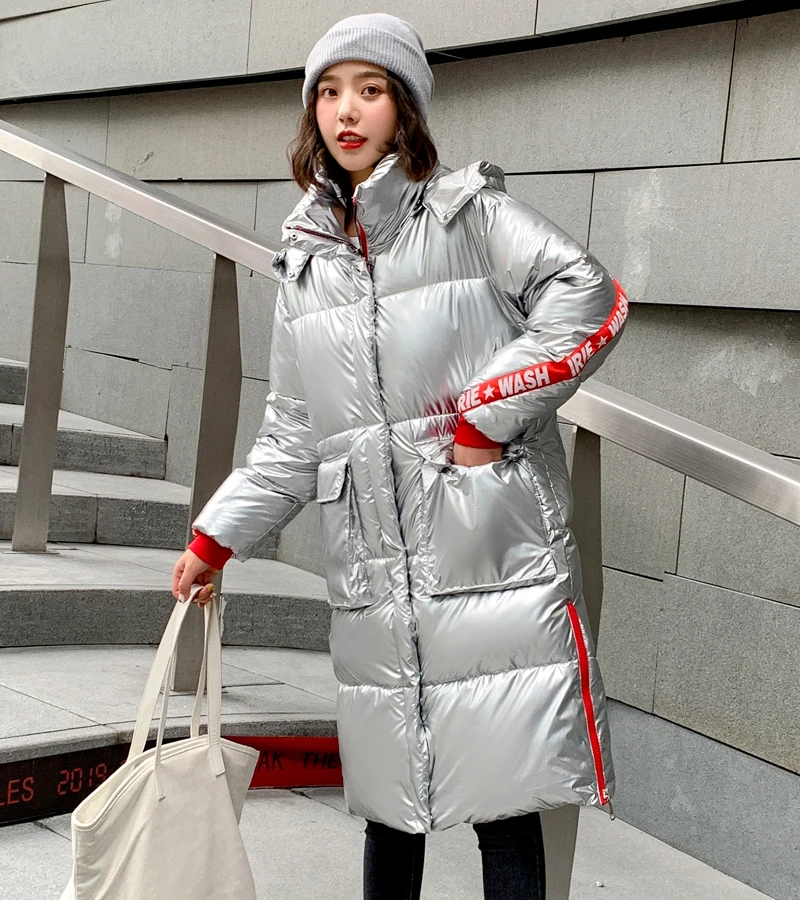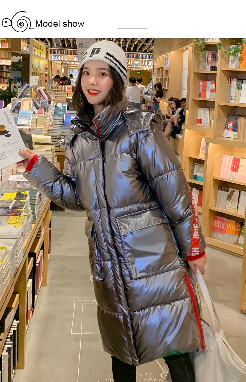 2019 зимняя длинная куртка для женщин, парка с воротником-стойкой, Женское пальто с капюшоном из блестящей ткани, длинная теплая хлопковая подкладка