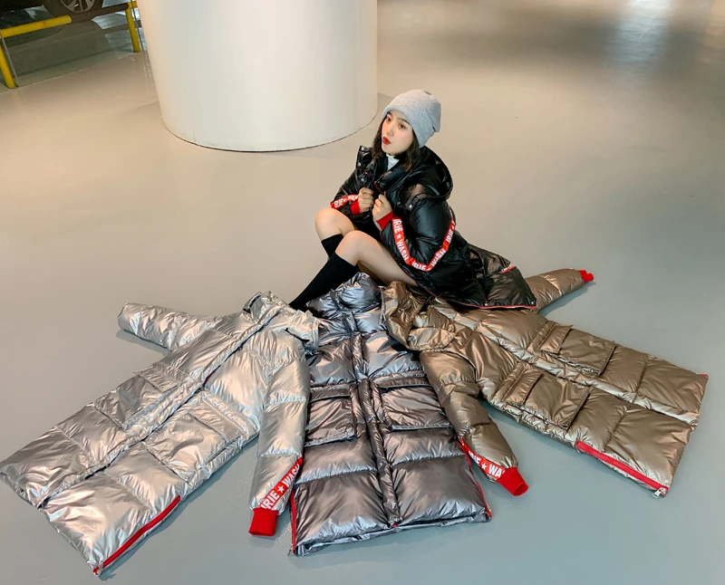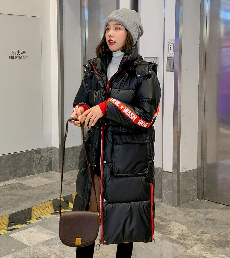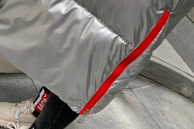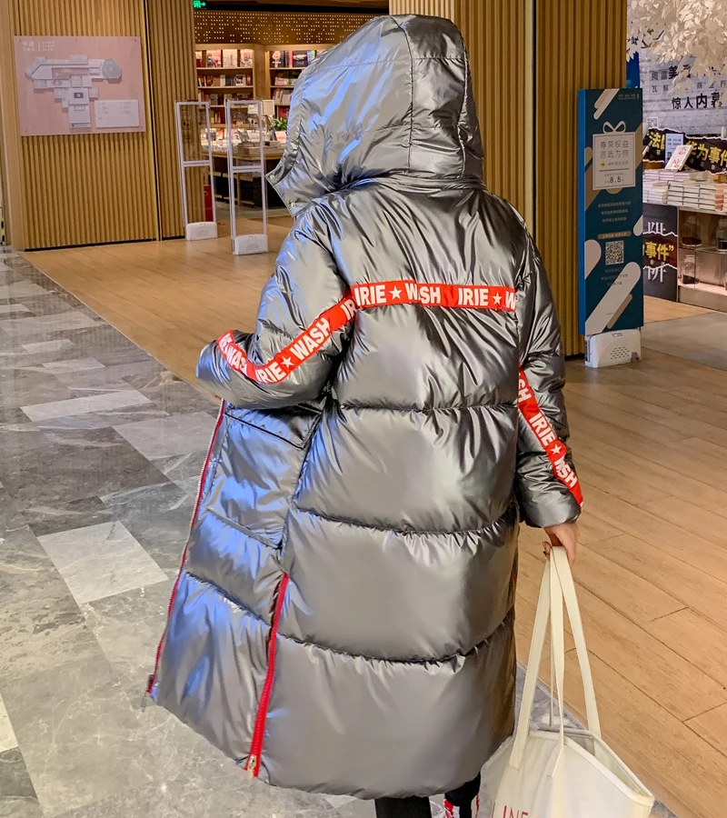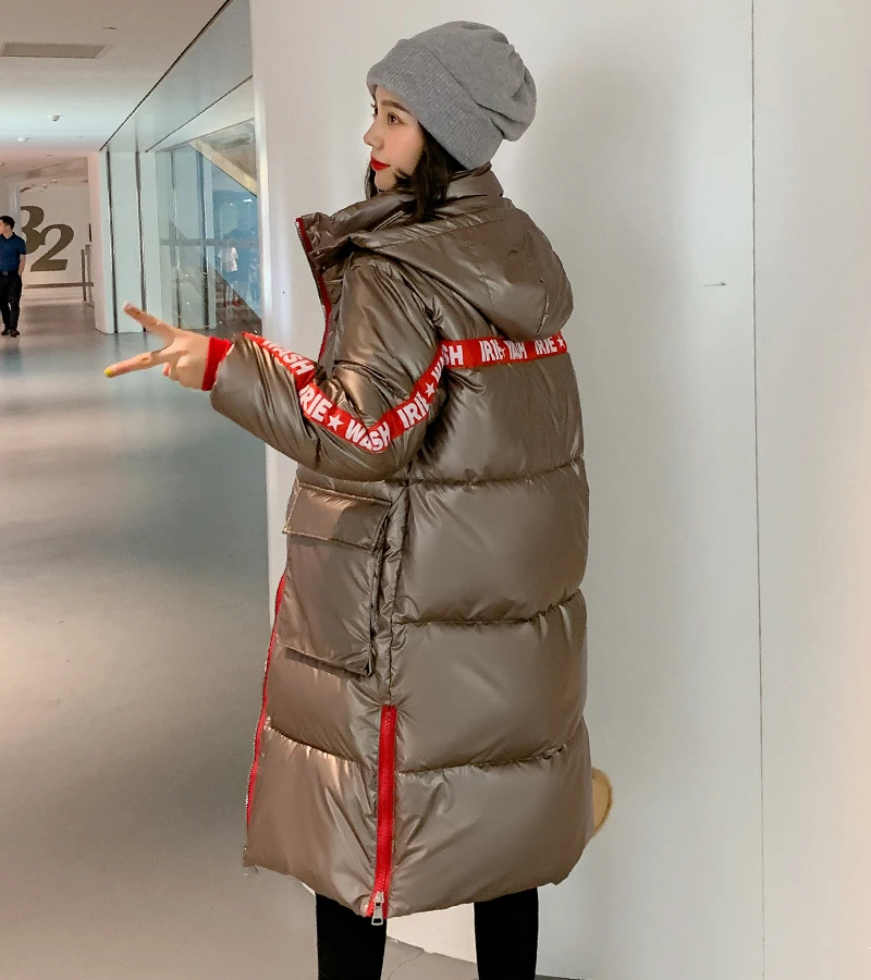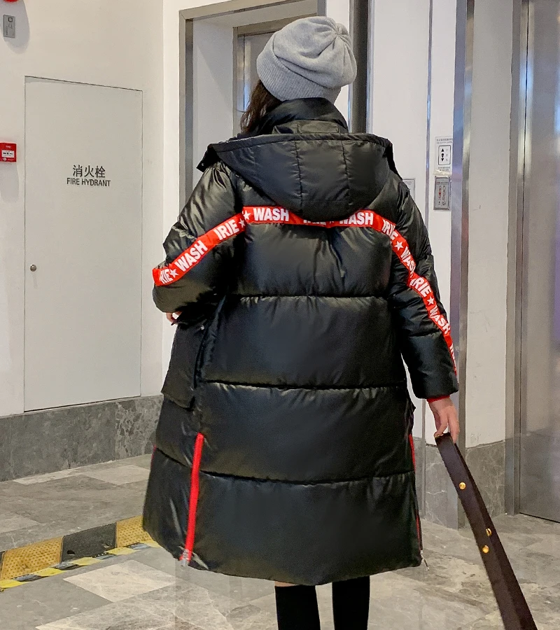 2019 зимняя длинная куртка для женщин, парка с воротником-стойкой, Женское пальто с капюшоном из блестящей ткани, длинная теплая хлопковая подкладка